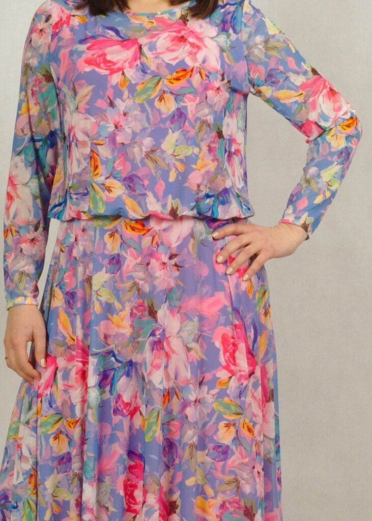 Góra sukienki jest prosta, z dekoltem półokrągłym i z długim rękawem.