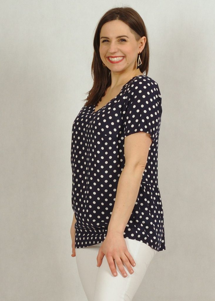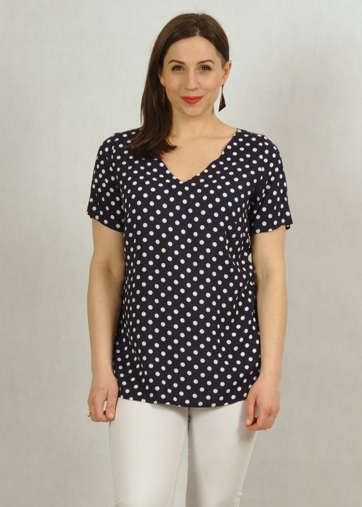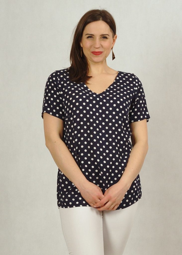 Bluzka występuje w kilku wersjach kolorystycznych: w zieleni z białymi groszkami, w granacie z białymi groszkami i w bieli z czarnymi groszkami.