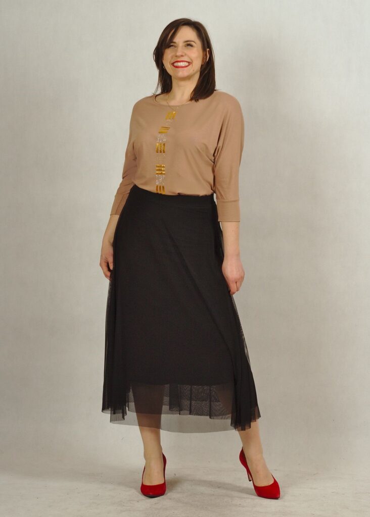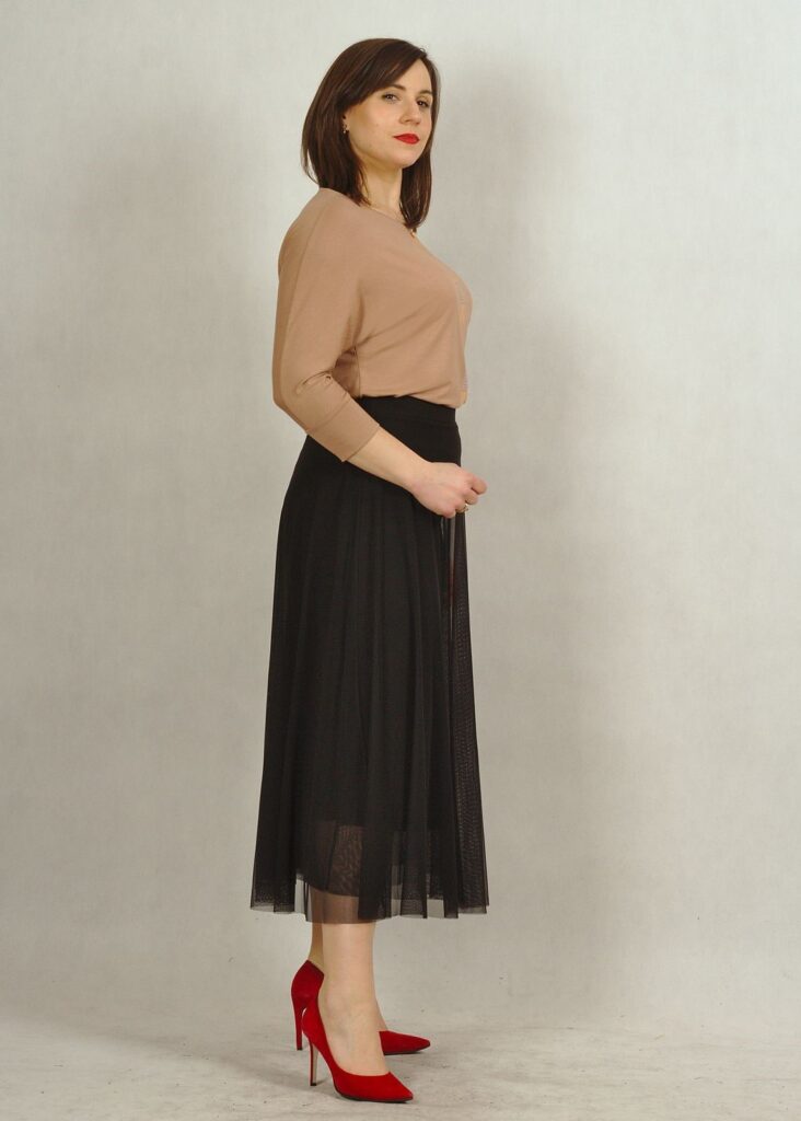 To bluzka, która idealnie pasuje do spódnicy lub spodni, ma doskonałą długość.