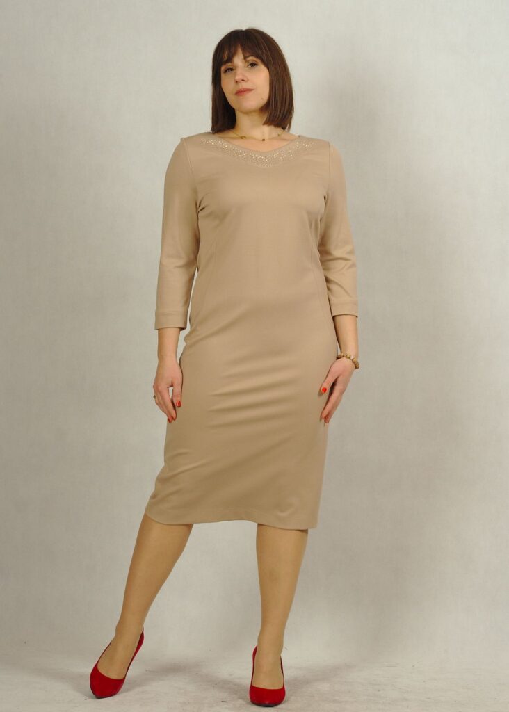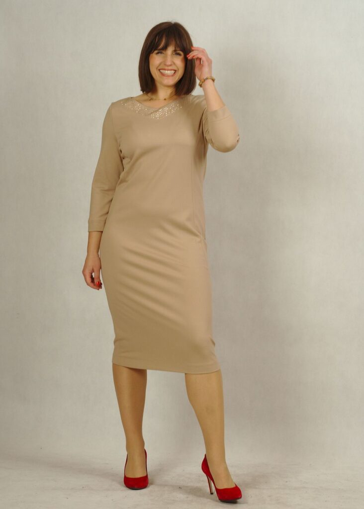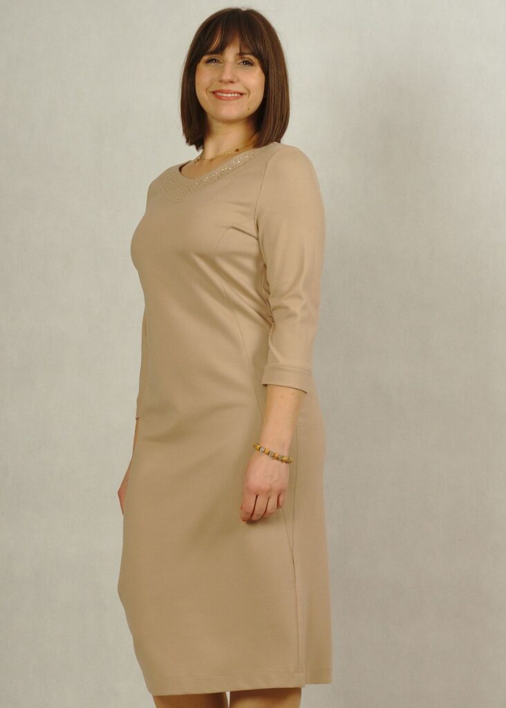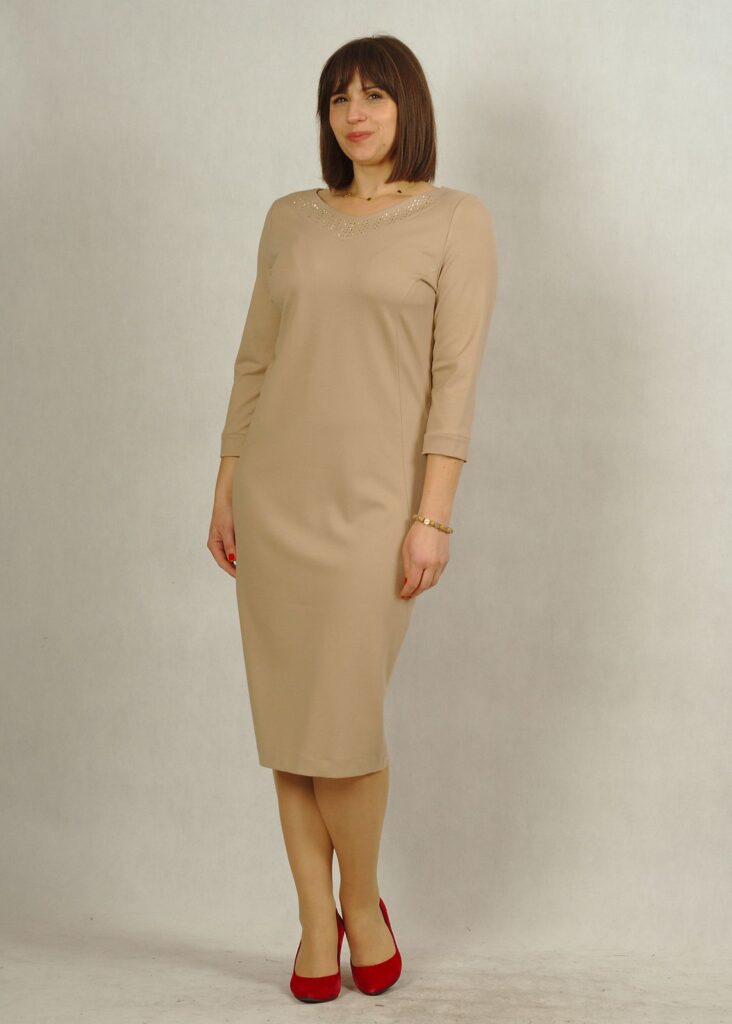 Beżowa sukienka to elegancka propozycja na wieczór, święta i inne okazje.