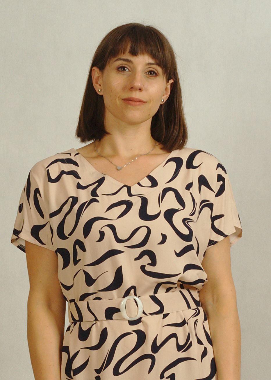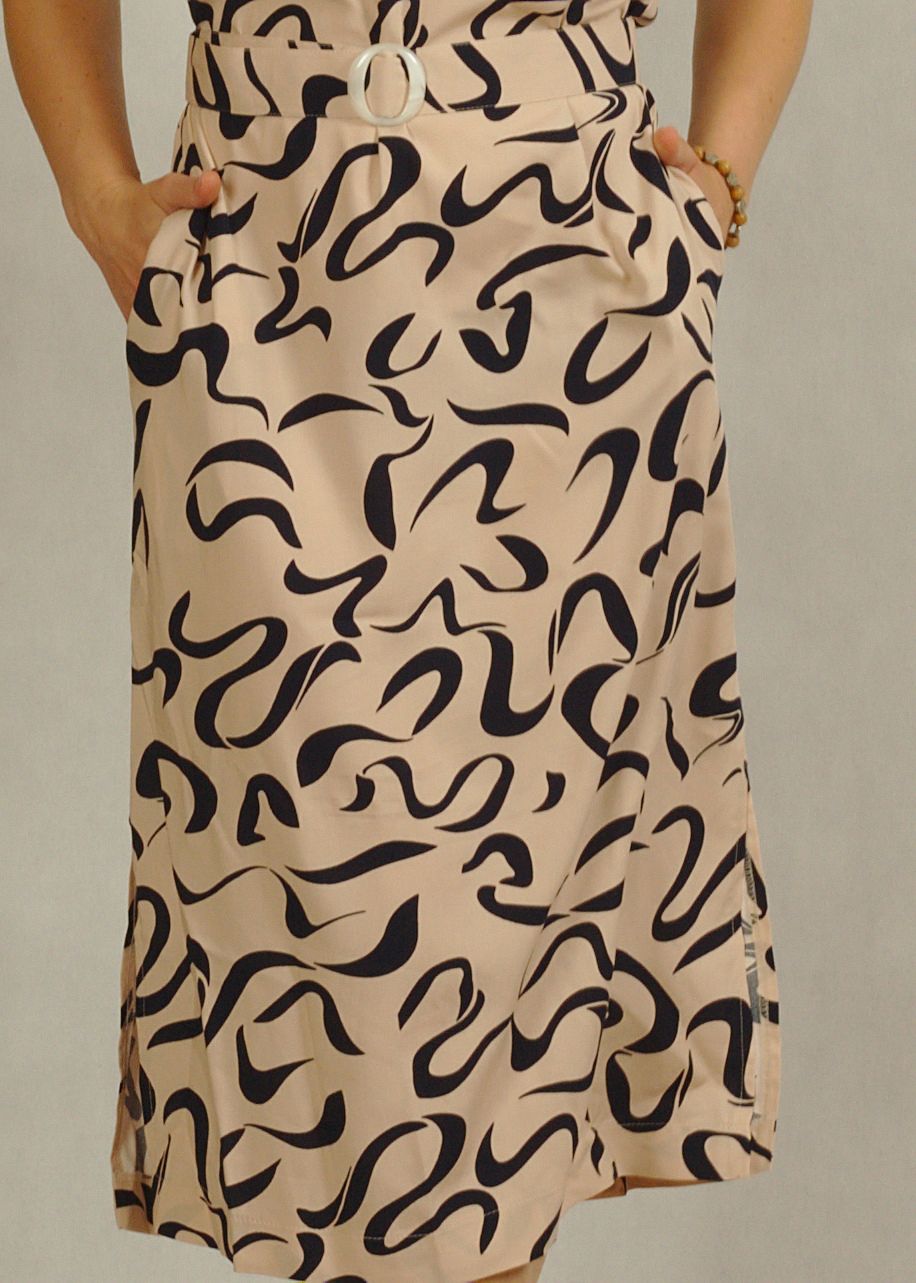 Beżowo-granatowy wzór przyciąga uwagę, a subtelne rozcięcia na rękawkach dodają lekkości.