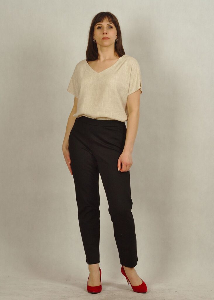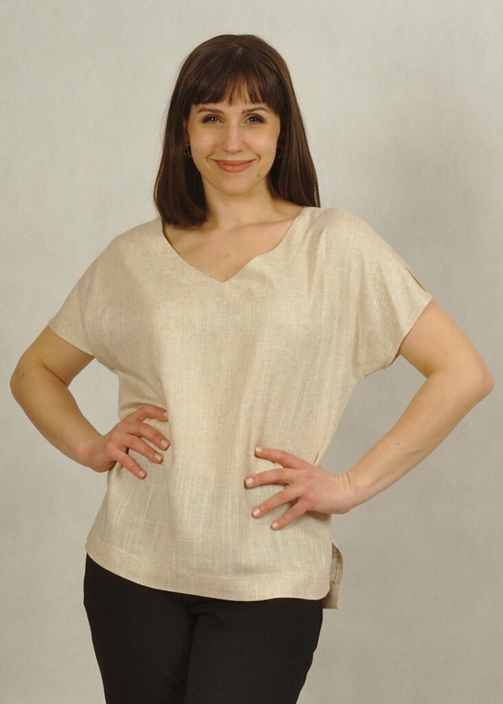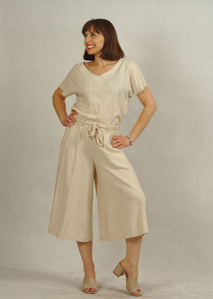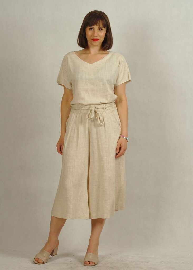 Ten top lniany łączy w sobie przewiewność, elegancję i prostotę. Jako bluzka jednokolorowa, doskonale komponuje się z różnymi stylizacjami – od casualowych po bardziej eleganckie.