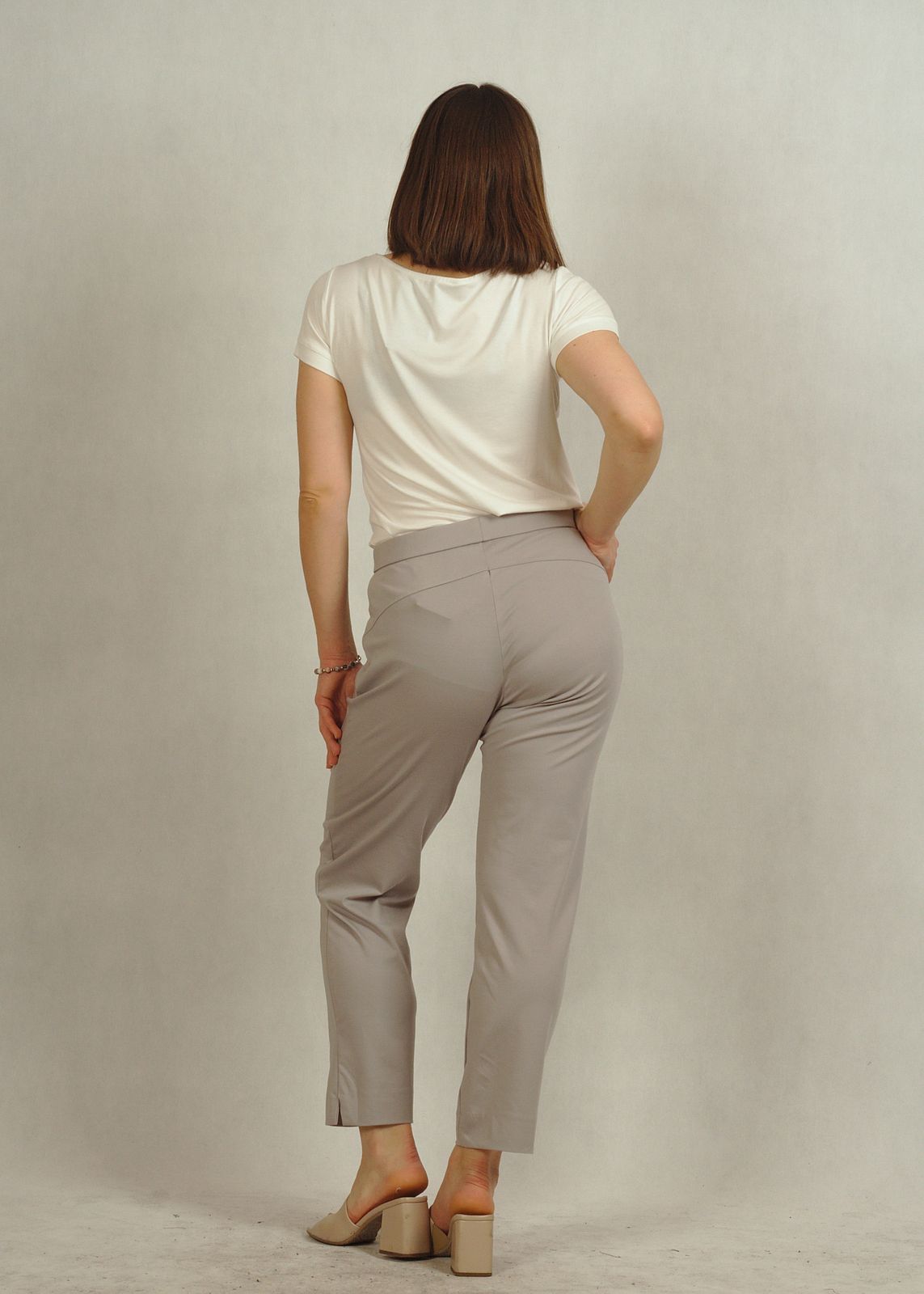 Modelka w białej bluzce ma 165 cm wzrostu i nosi rozmiar L.