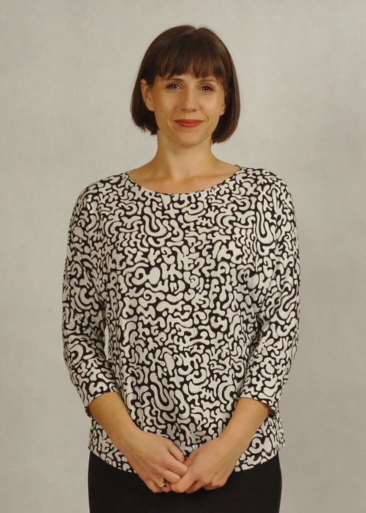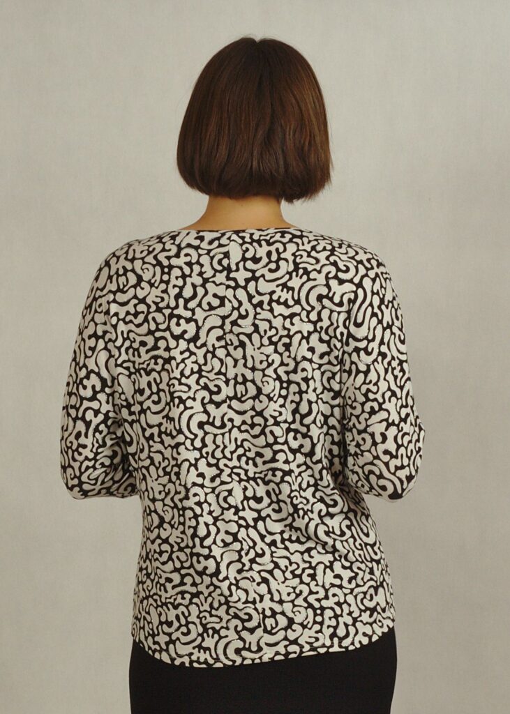 Bluzka we wzory posiada półokrągły dekolt. Rękaw 3/4 kimono z mankietem, tzw.’ nietoperz’ daje swobodę w użytkowaniu.
