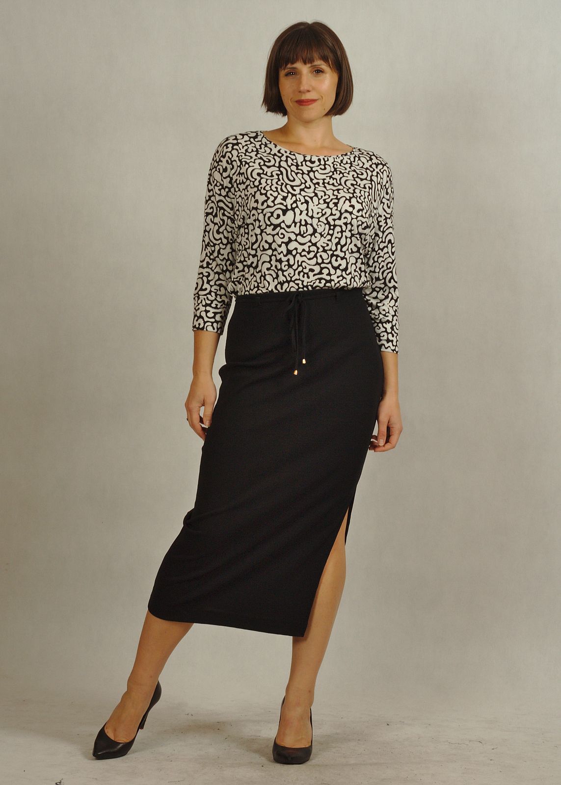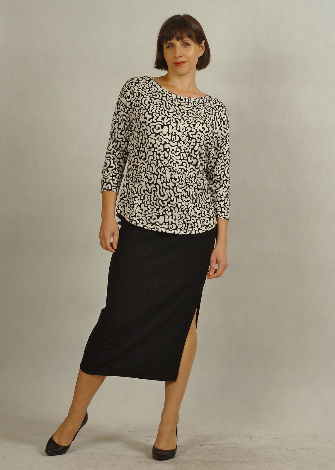 Uniwersalna biała bluzka dzianinowa (wiskoza, elastan) na co dzień w piękne czarne wzory z delikatnym srebrnym połyskiem*.