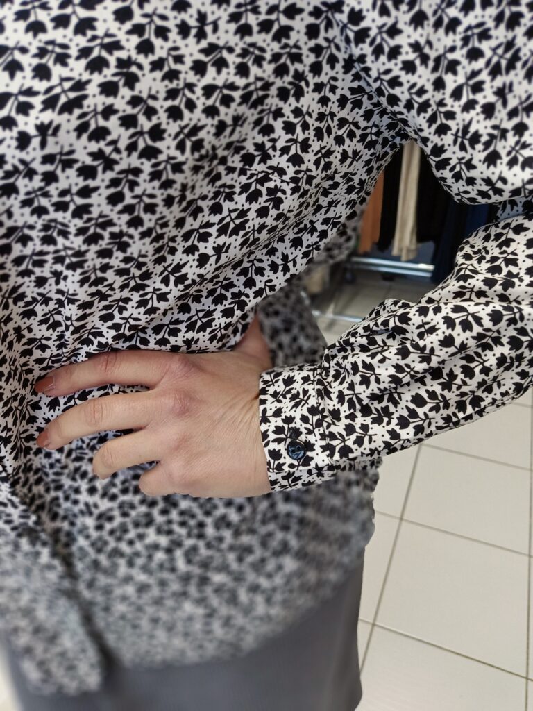Koszula w czarne kwiatki ma długi rękaw, dobrze wygląda też z wywiniętym mankietem 🙂