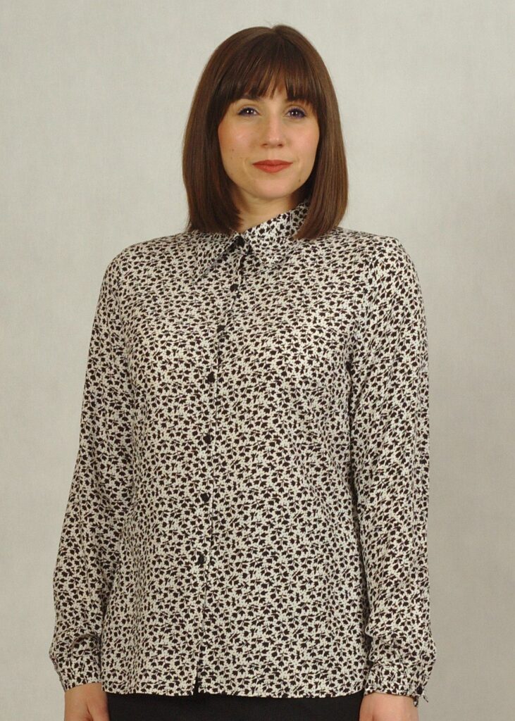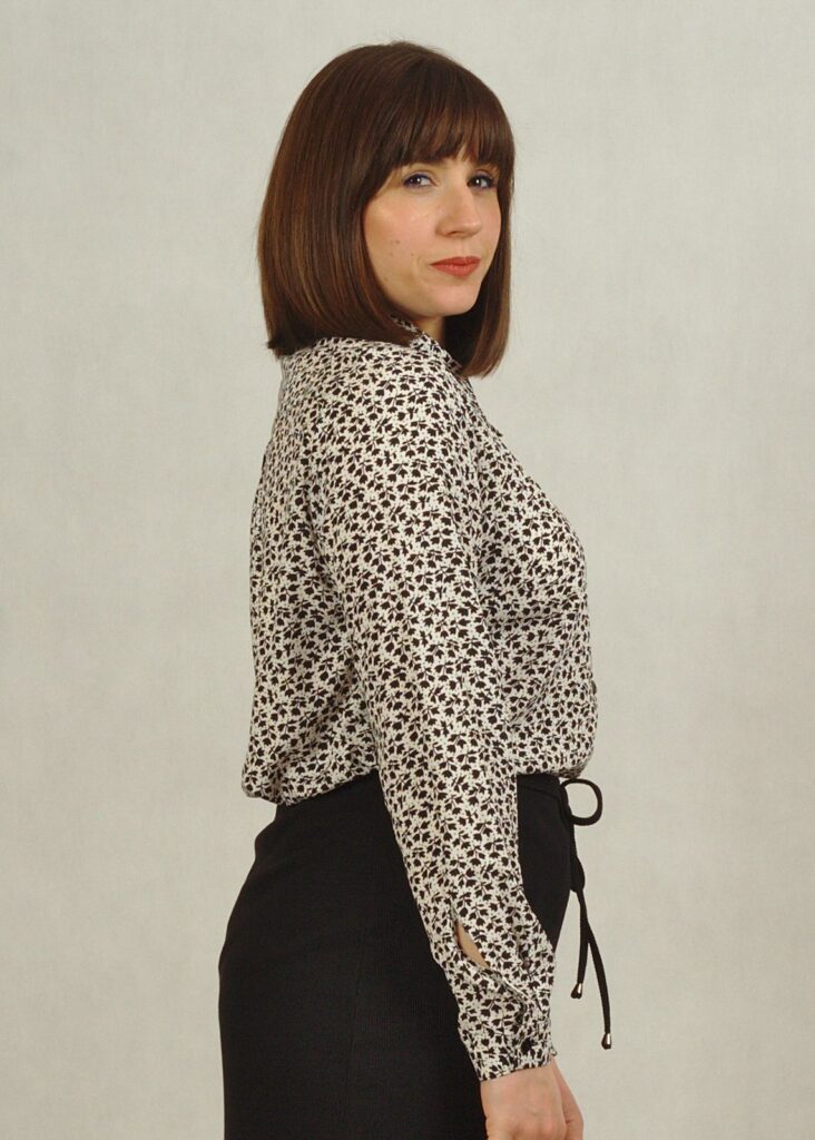 Koszula z kołnierzykiem – zapinana jest na drobne czarne guziczki i przy dekolcie wykończona pięknym, przedłużonym kołnierzykiem.