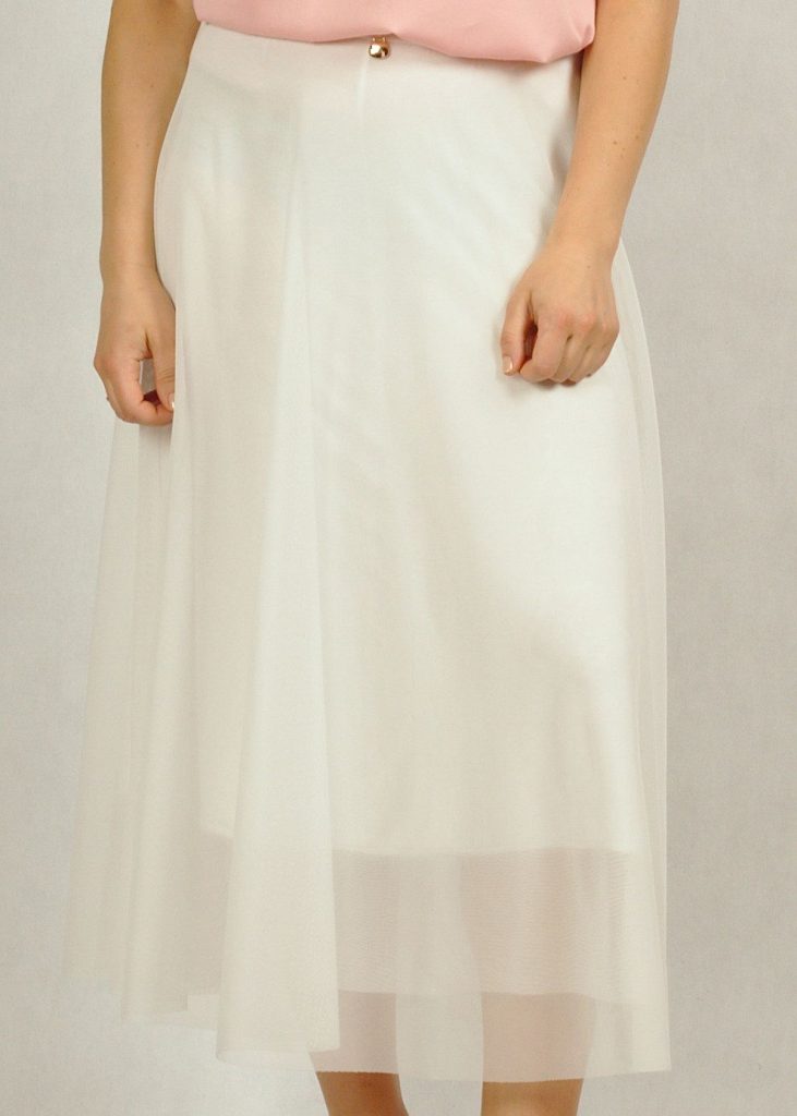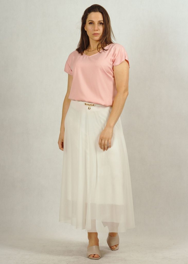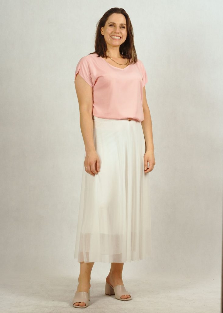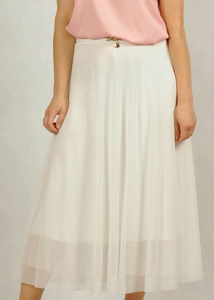 Długa spódnica składająca się z dwóch części – z wiskozowej podszewki z dzianiny oraz z poliestrowej siatki drukowanej.