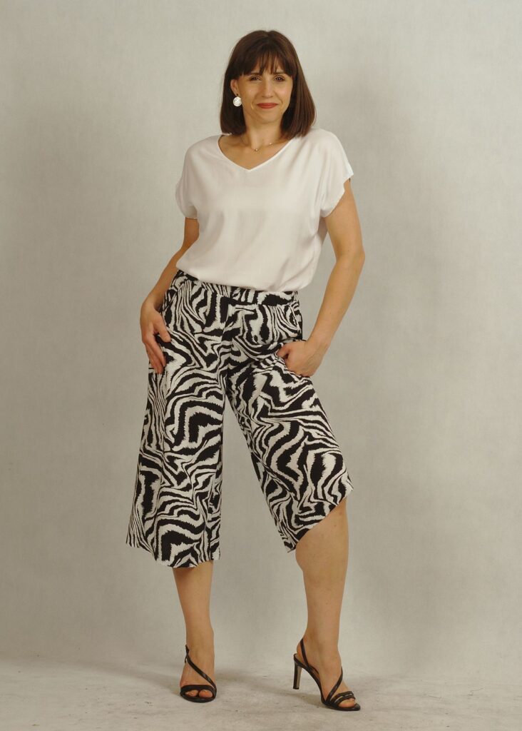 Bluzka ma piękny dekolt w serek, wysmuklający sylwetkę. Rękaw luźno opadający krótki, z drobnym rozcięciem na ramieniu.