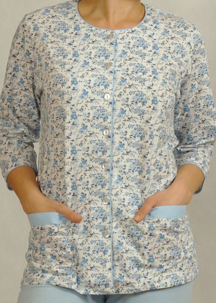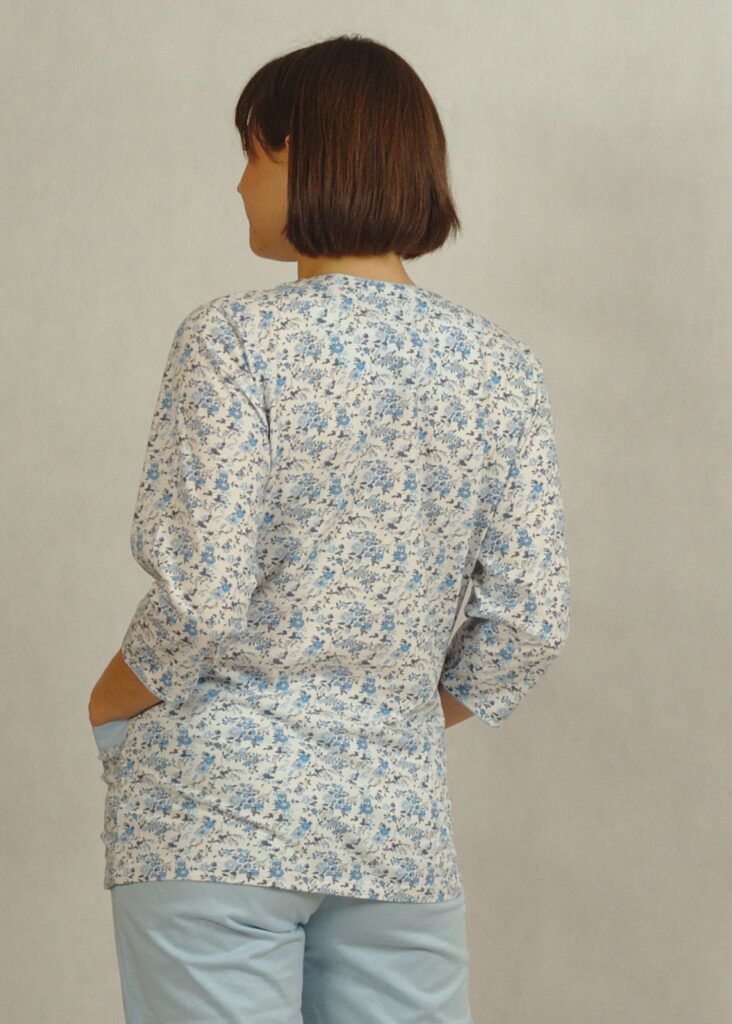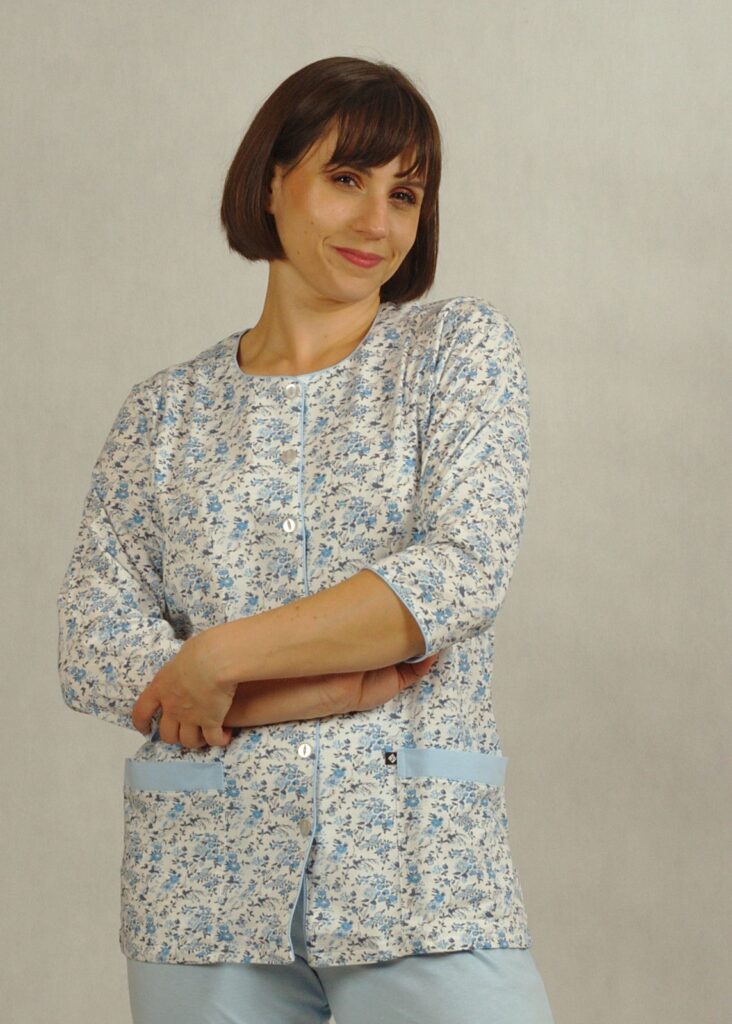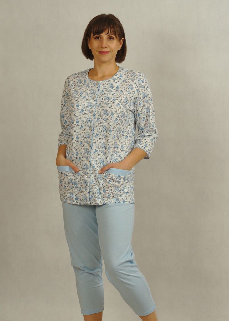 Niebieska piżama rozpinana – góra ma śliczny nadruk w kwiatki, a spodnie są jednokolorowe.