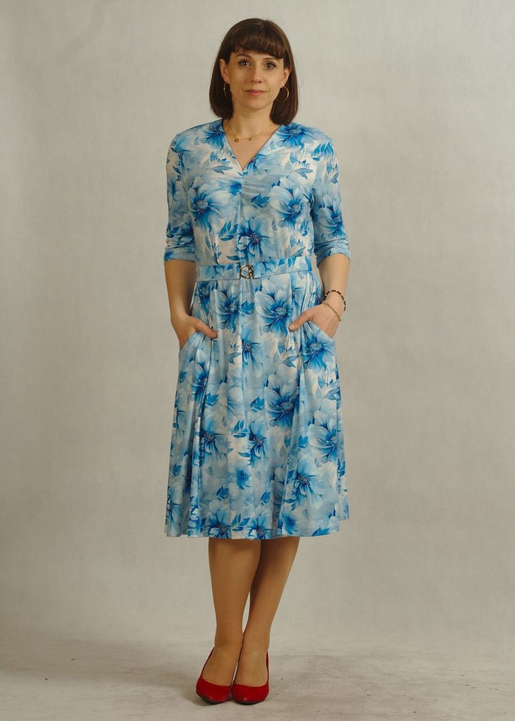 Kobieca sukienka z dekoltem w serek optycznie wysmukla szyję, natomiast sukienka z kieszeniami zwiększa praktyczność modelu.