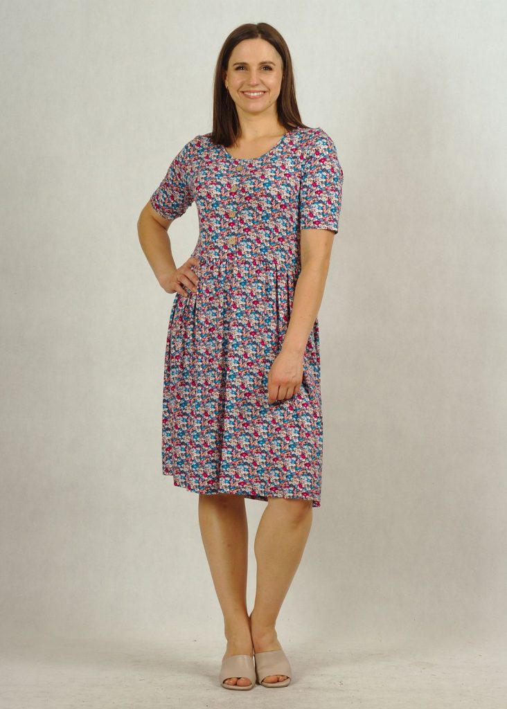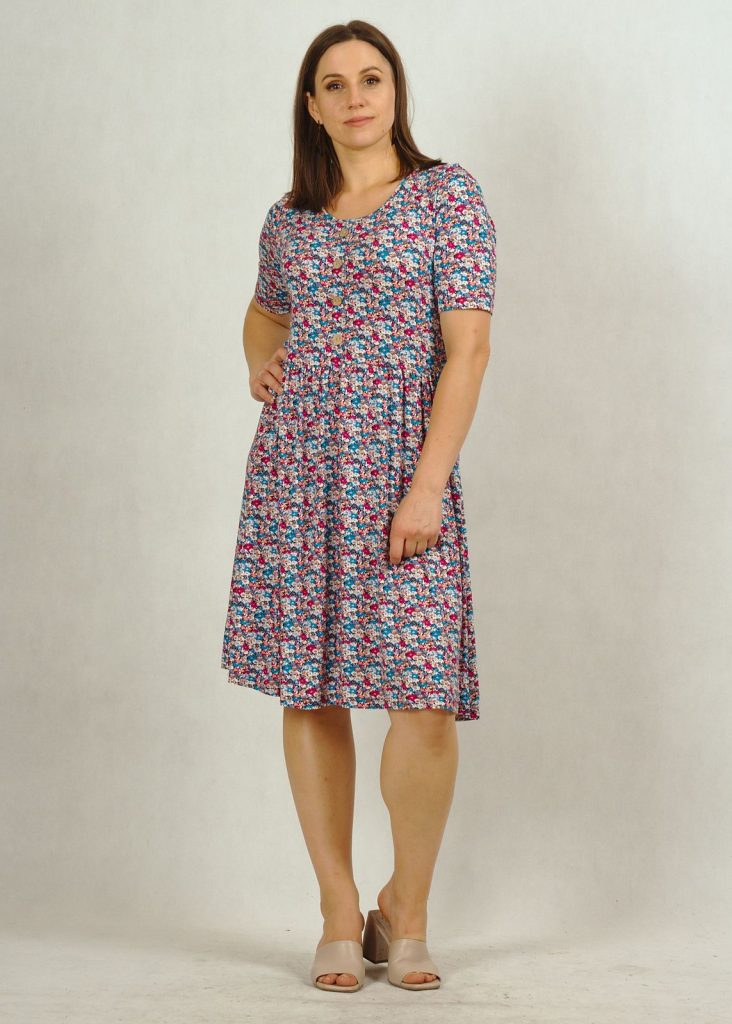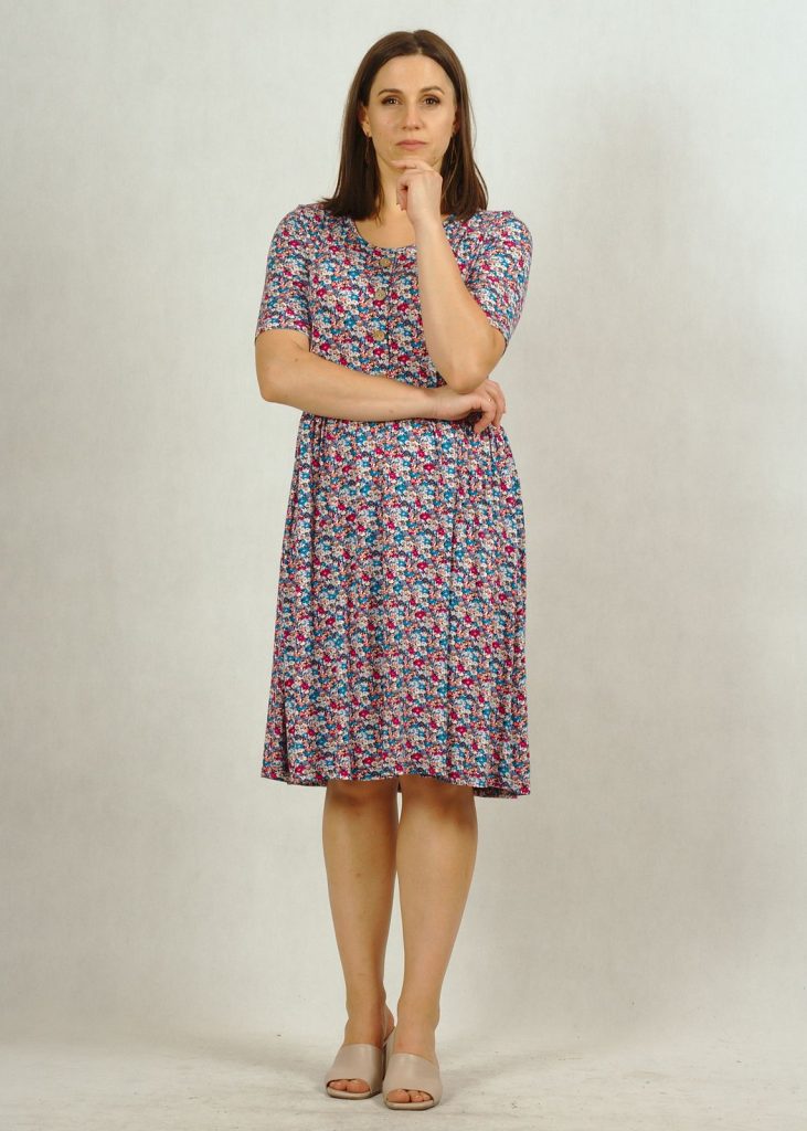 Niezwykle wygodna sukienka dzianinowa na krótki rękaw. Posiada półokrągły dekolt ozdobiony czterema “kokosowymi” guziczkami.