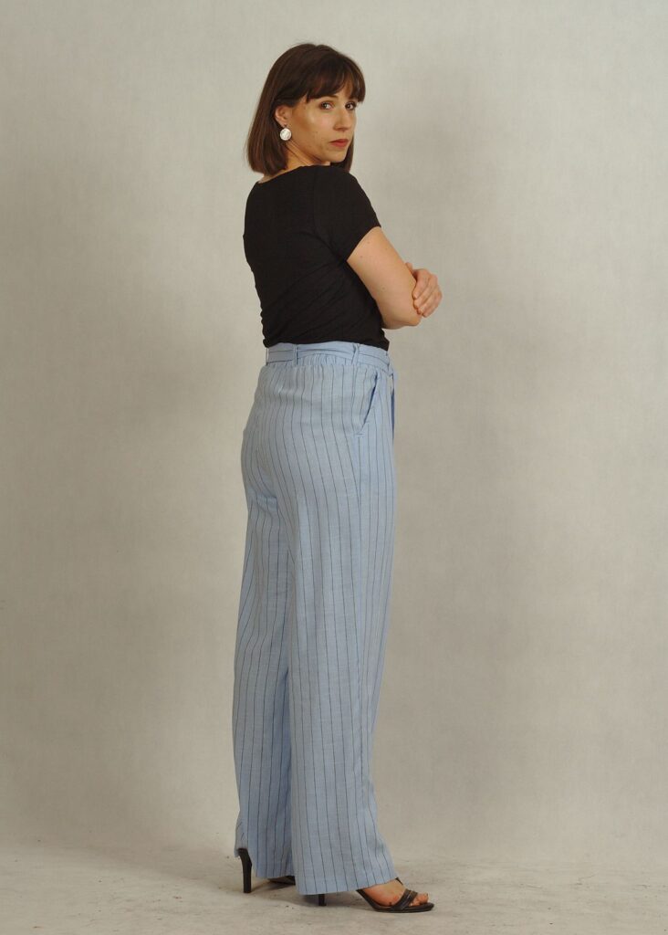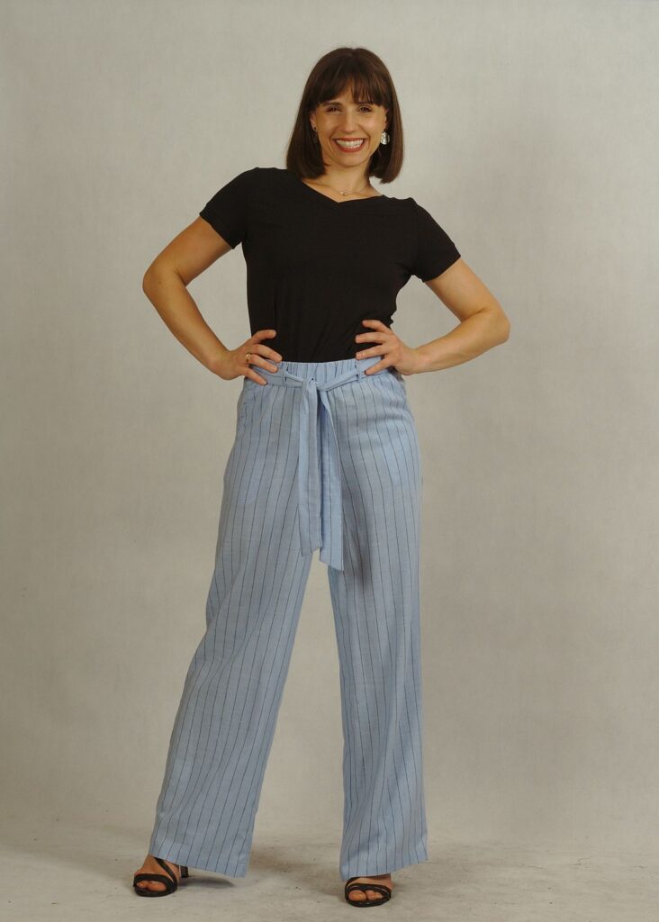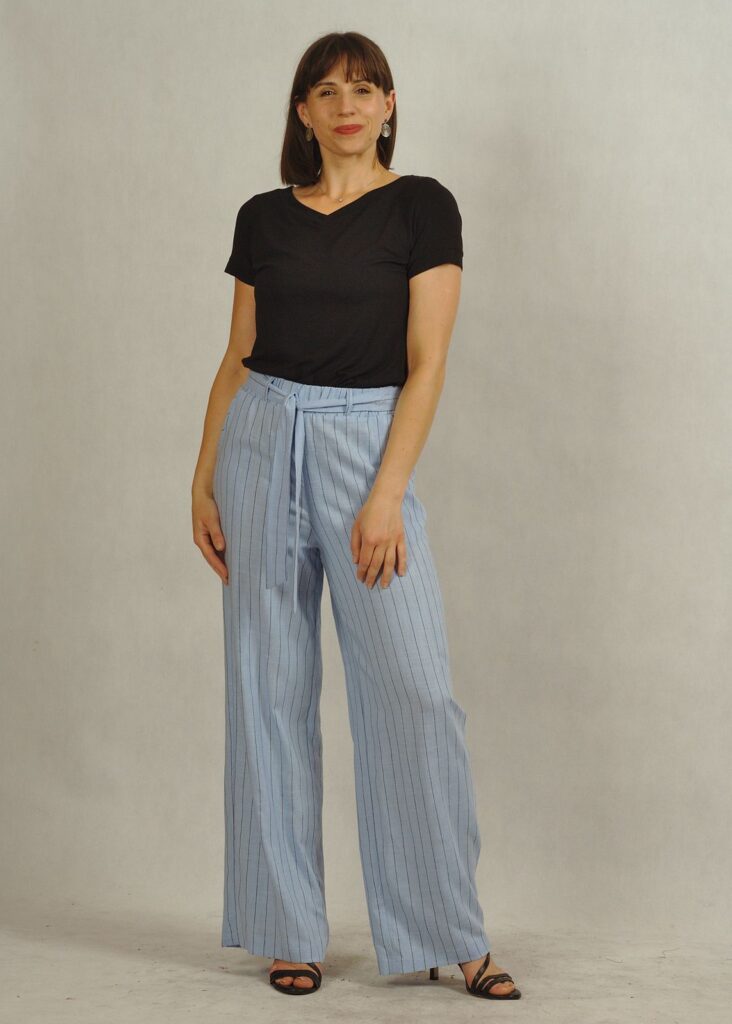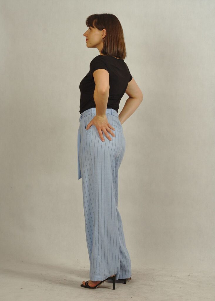 Błękitne spodnie z lnem to doskonały wybór także w ramach mody plus size – wygodne, modne i ponadczasowe.