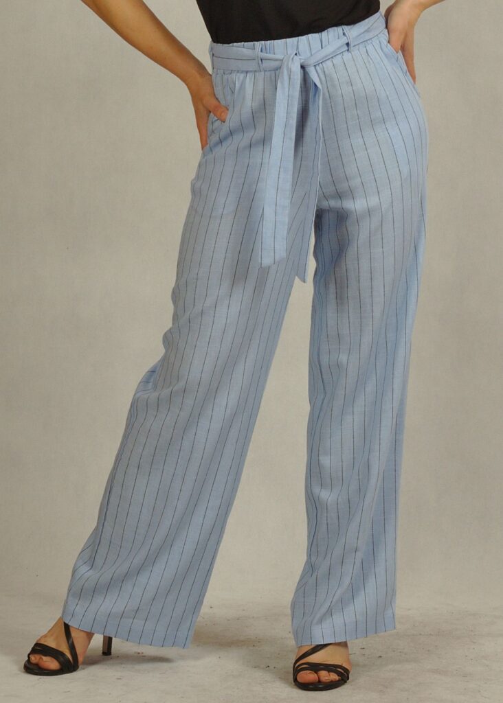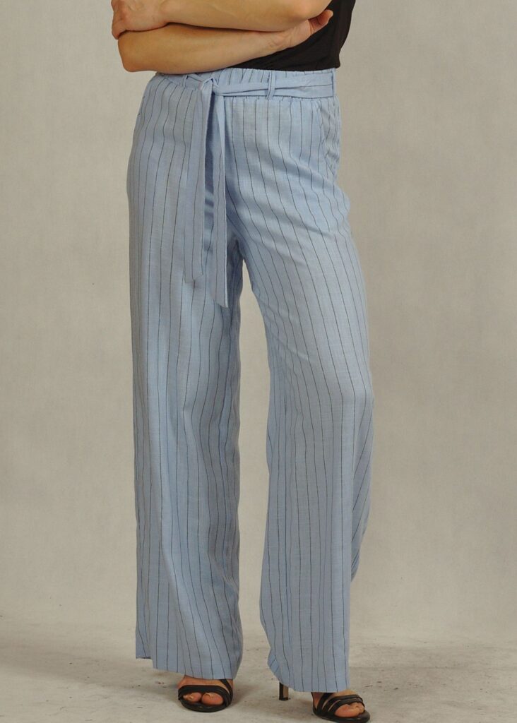 To klasyczne spodnie lniane z subtelnym wzorem w czarne paski, które optycznie wysmuklają sylwetkę i dodają elegancji.