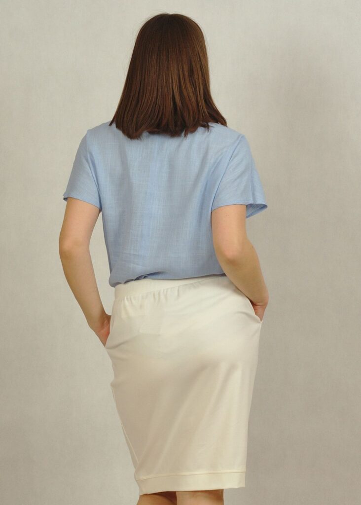 Ta jednokolorowa bluzka to idealny wybór na cieplejsze dni – uszyta z naturalnej, przewiewnej tkaniny lnianej, zapewnia komfort noszenia przez cały dzień.