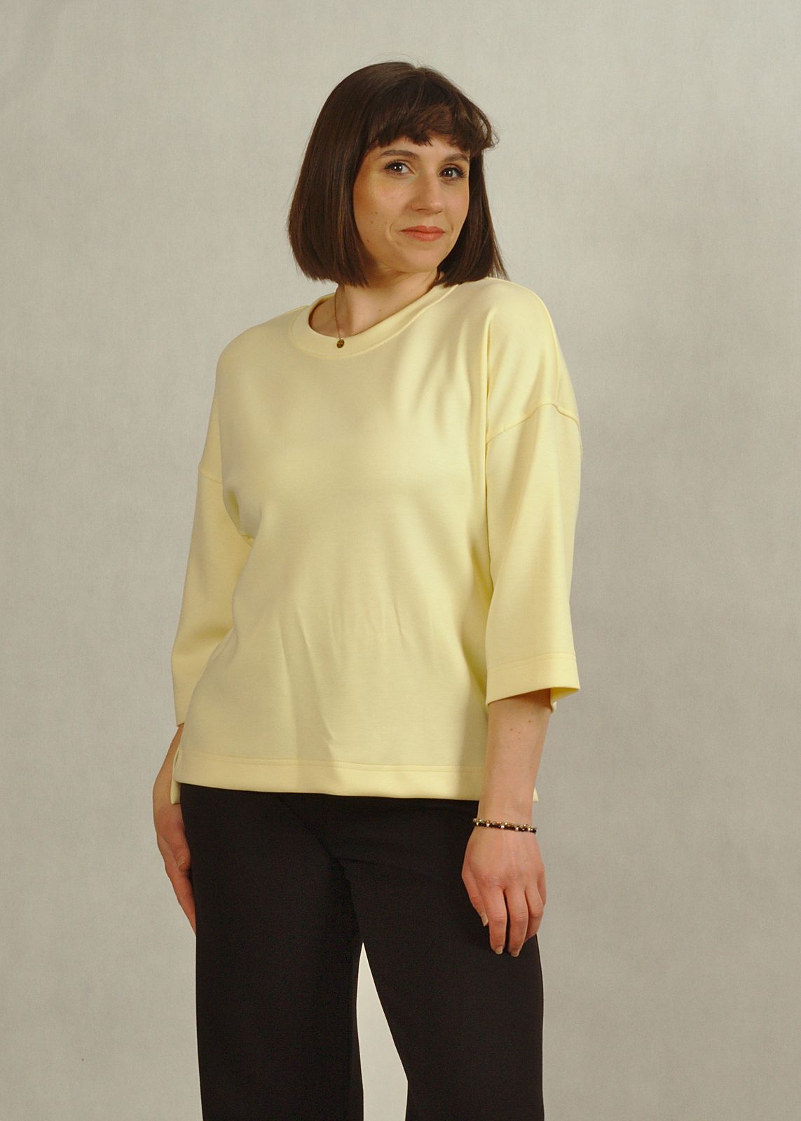 Klasyczny fason, jakim jest bluzka z półokrągłym dekoltem, sprawia, że model doskonale dopasowuje się do różnych stylizacji.