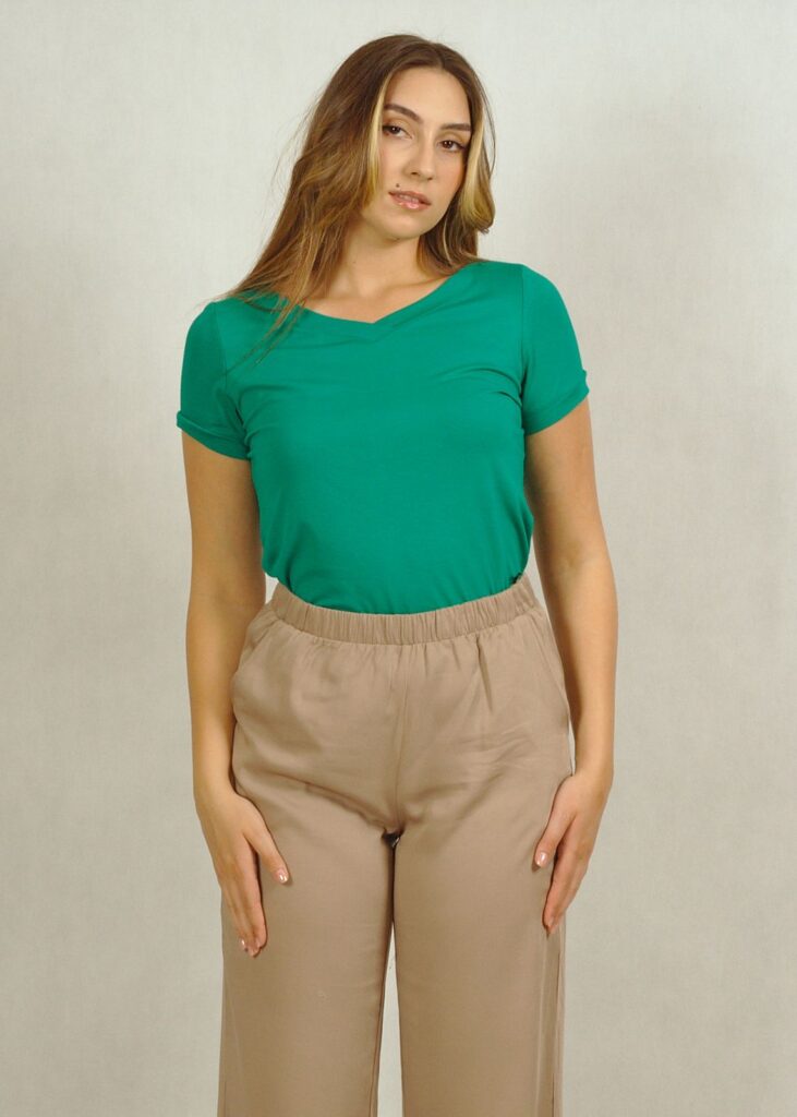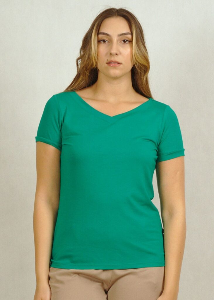 Zielona* bluzka bazowa uszyta jest z dzianiny wiskozowej i sprawdzi się w wielu sytuacjach.