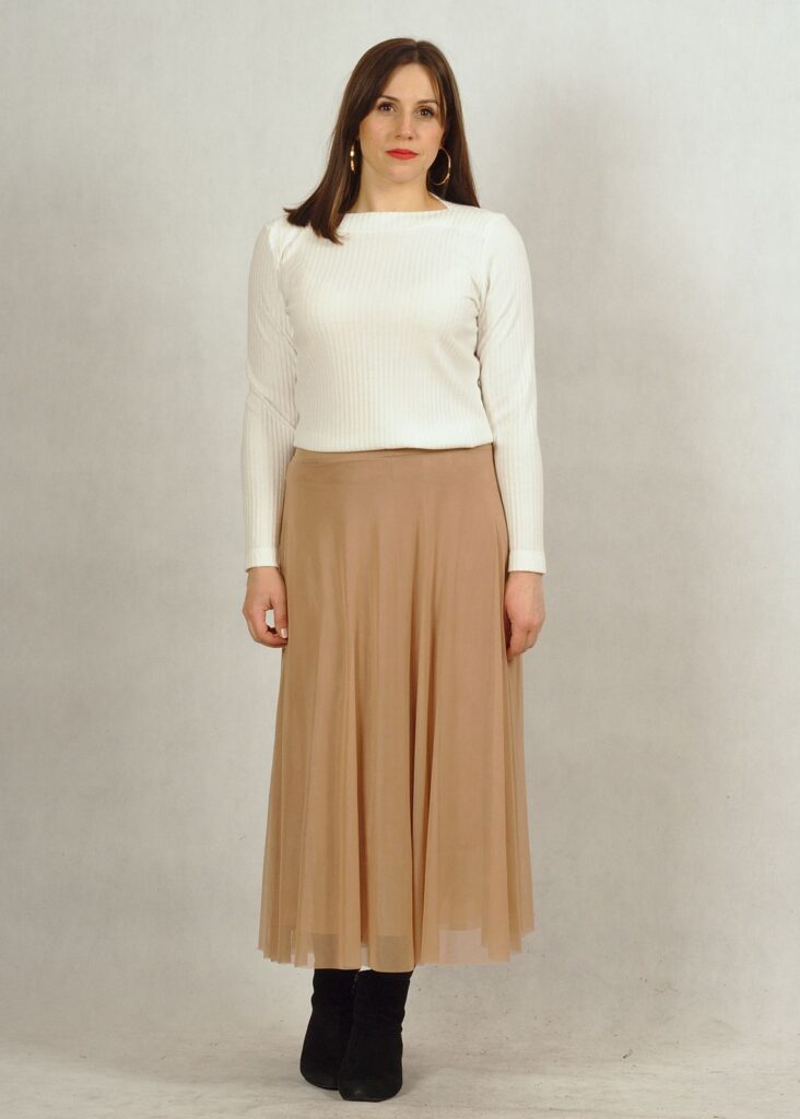 Na zdjęciu bluzka świetnie współgra ze spódnicą.