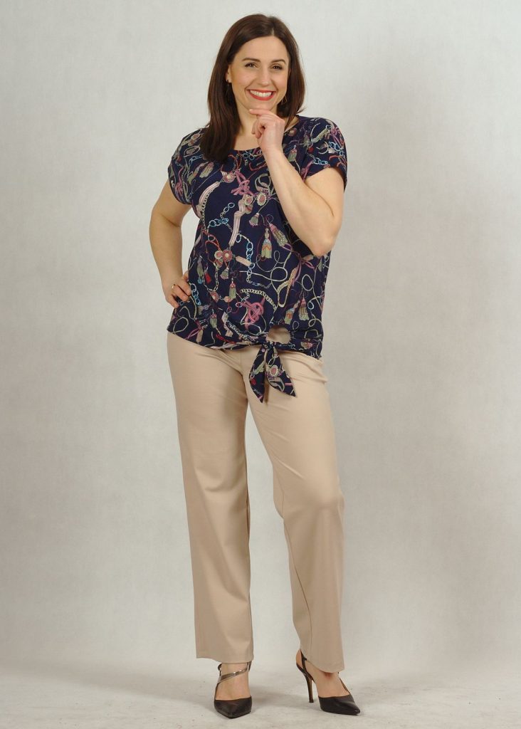 Bluzka z dekoltem półokrągłym z wiązaniem na dole i dużą plisą. Rękaw bluzki jest krótki, lekko opadający na ramię.