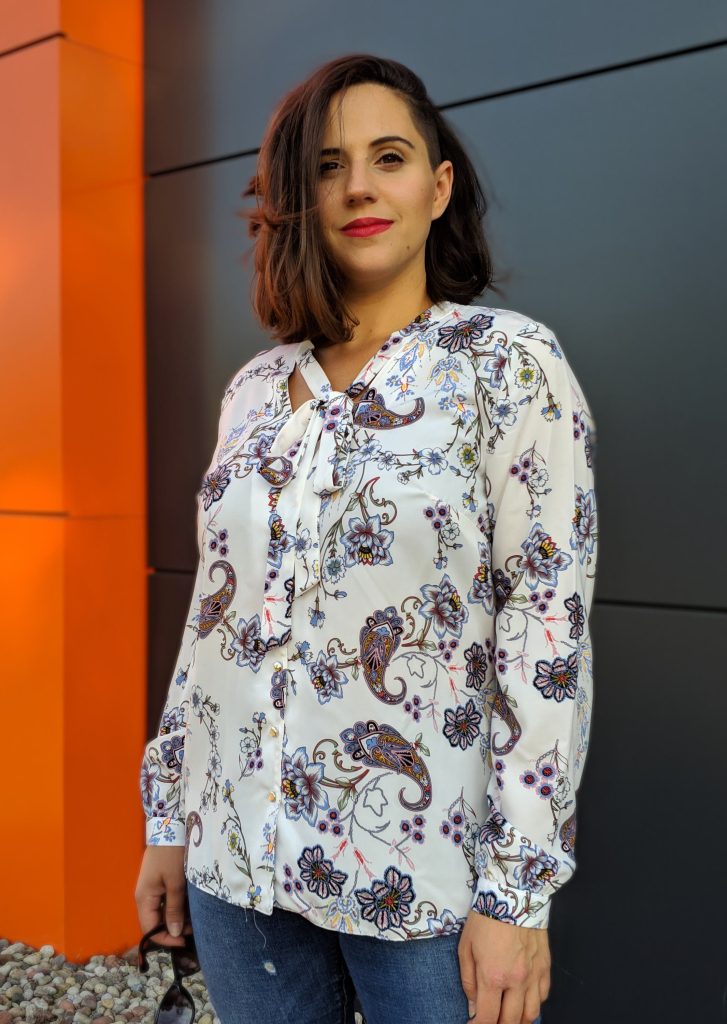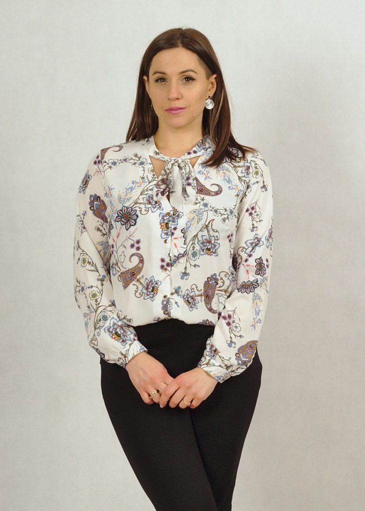 Koszulowa bluzka z długim rękawem i z wiązaniem przy dekolcie.