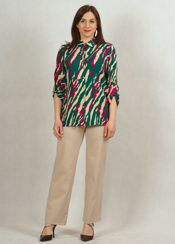 Kolorystyka bluzki bardzo żywa, przykuwająca spojrzenie. Kolor bazowy -beżowy z zielonymi i różowymi zygzakami*
