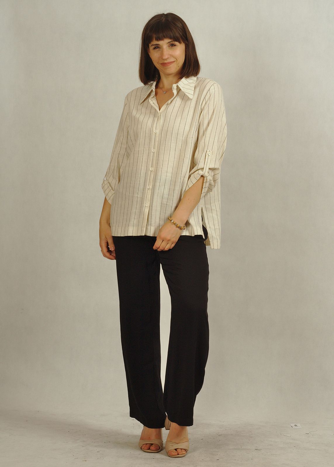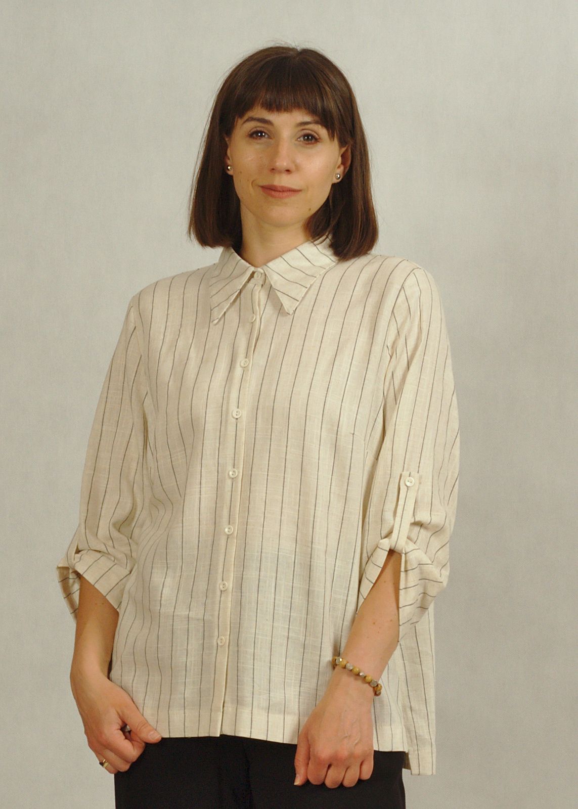Bluzka koszulowa z lnu i wiskozy beżowa w czarne paski /835/