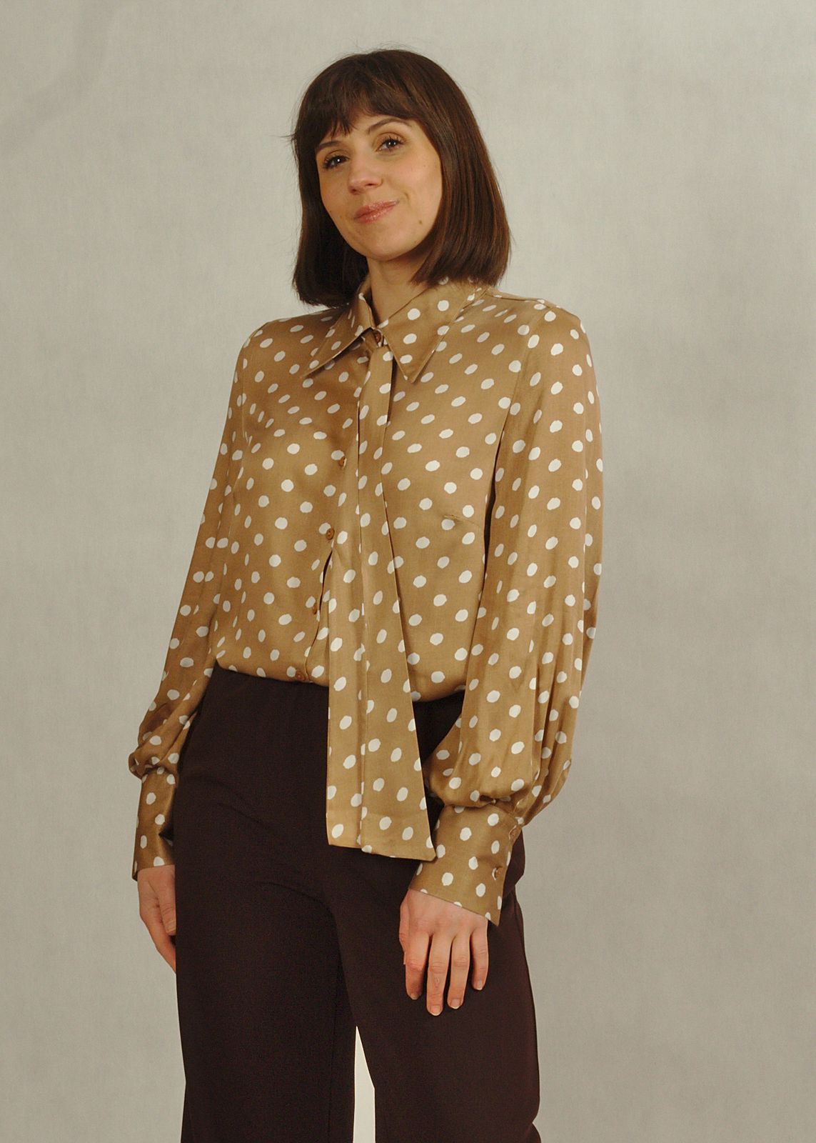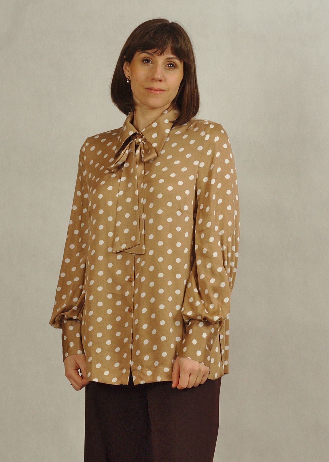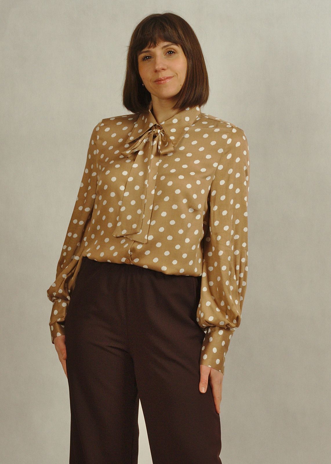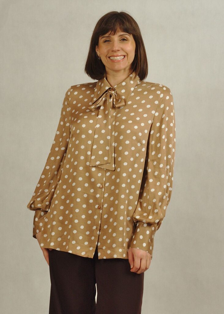 Bluzka koszulowa z wiązaniem beżowa w klasyczne białe grochy idealnie uzupełni Twoją szafę.