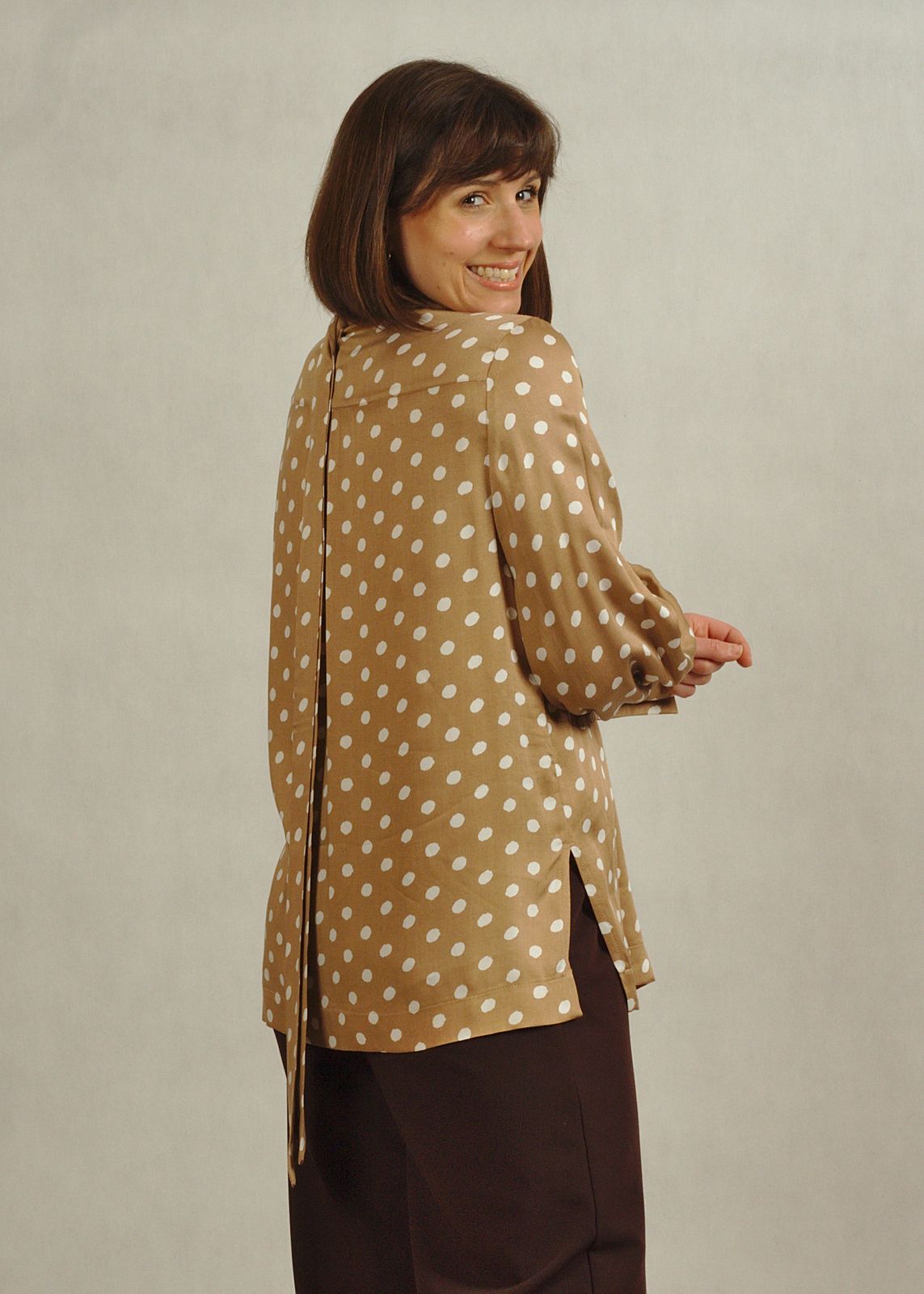 Bluzka koszulowa z wiązaniem beżowa w białe grochy /882/