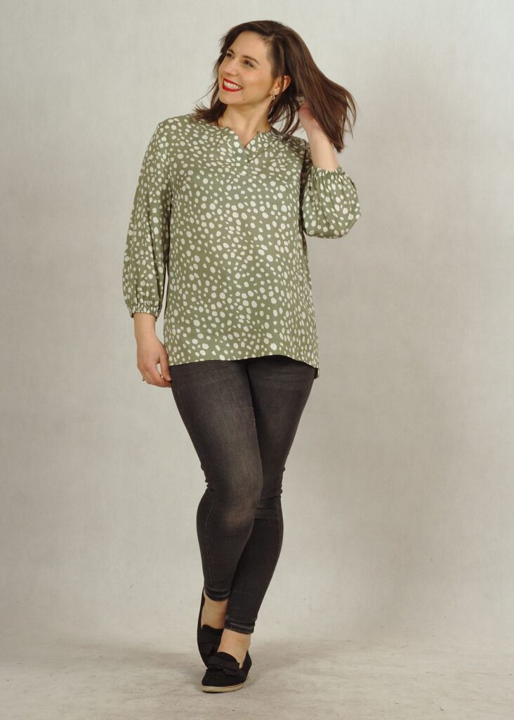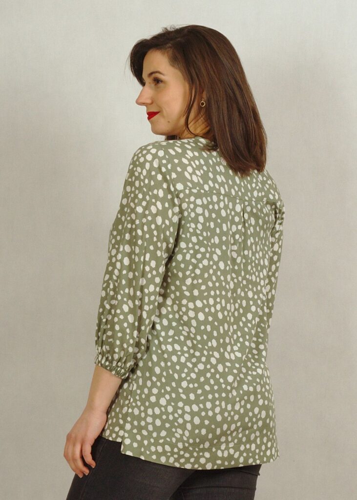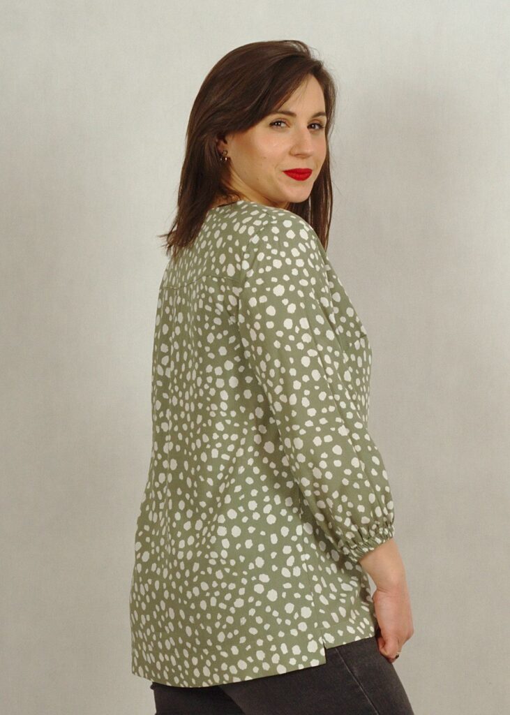 Bluzka ma bardzo ciekawy dekolt z obszytym rewersem, który ślicznie się prezentuje.