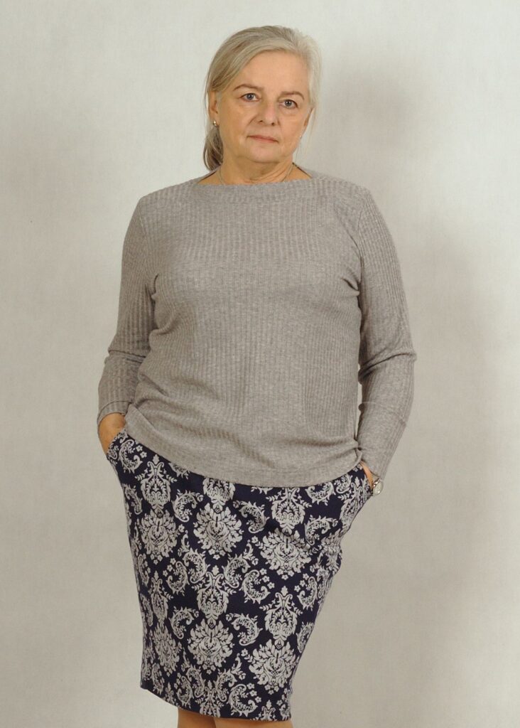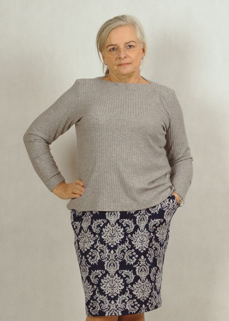 Na zdjęciu bluzka świetnie współgra ze spódnicą.