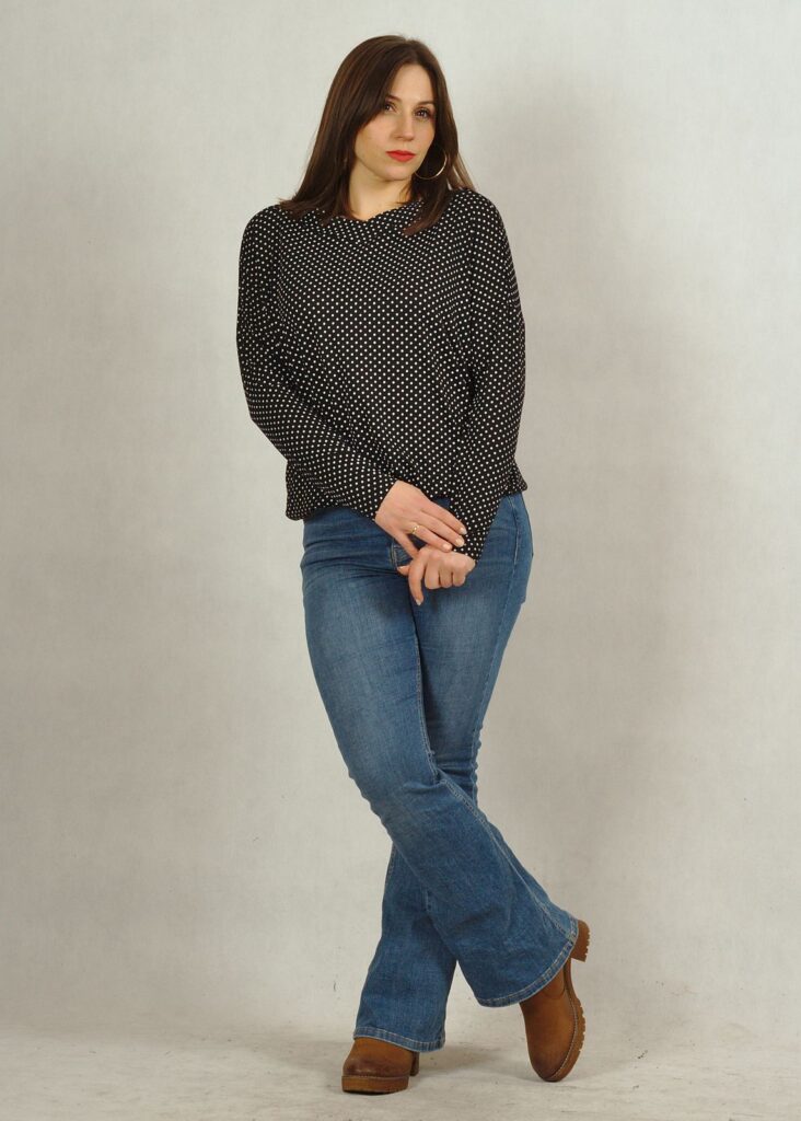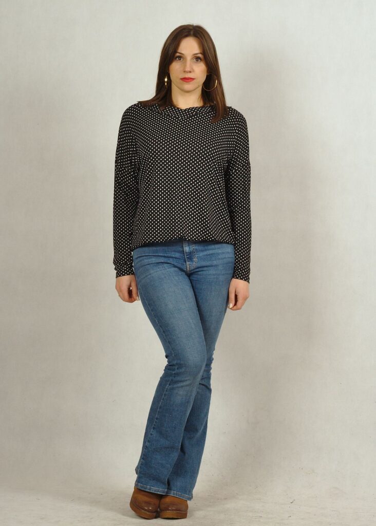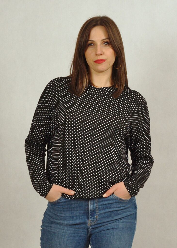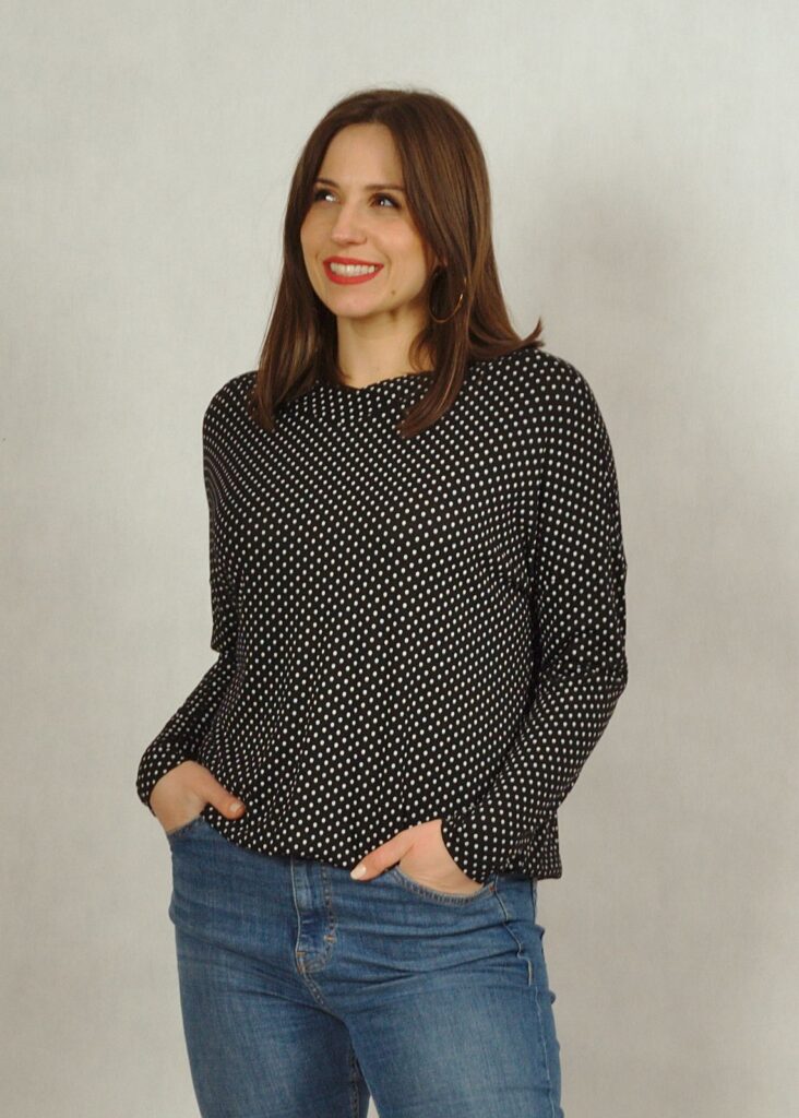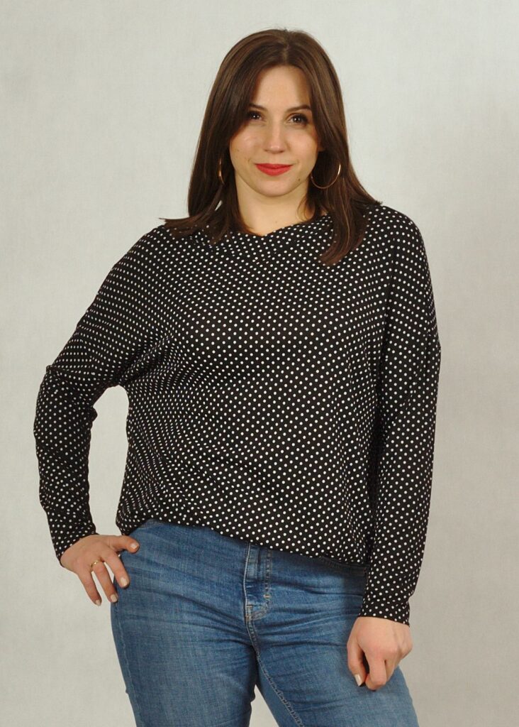 Elastyczna bluzka na gumce, z długim, nisko wszytym rękawem kimonowym.