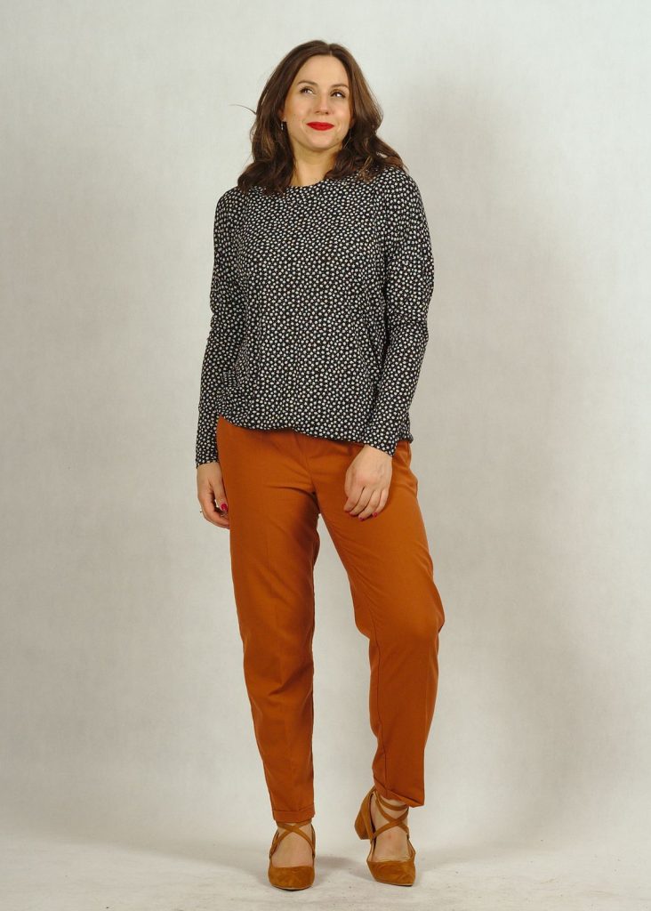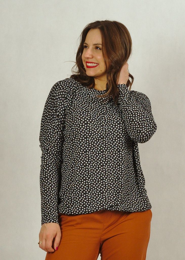 Elastyczna bluzka na gumce, z długim, nisko wszytym rękawem kimonowym.