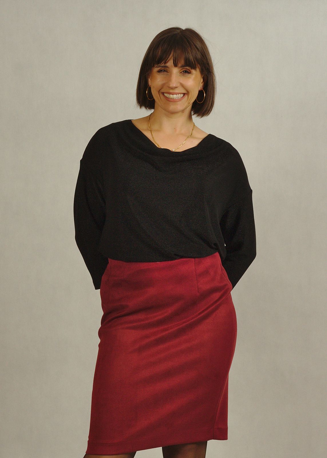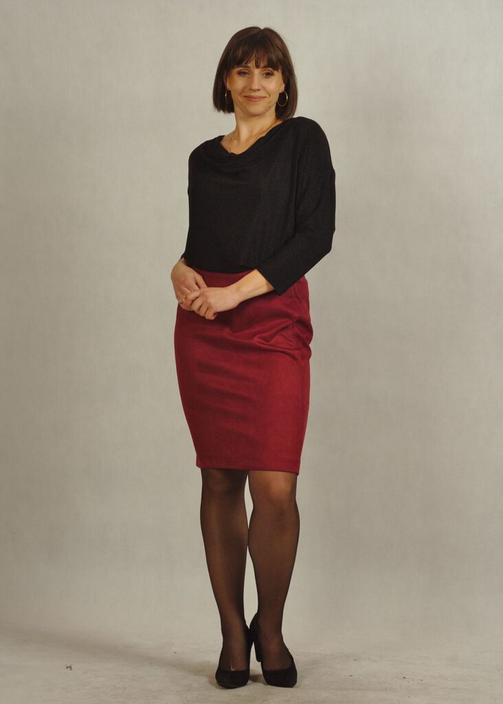 W naszej ofercie znajdziesz czarną spódnicę, którą ma na sobie modelka na zdjęciach: