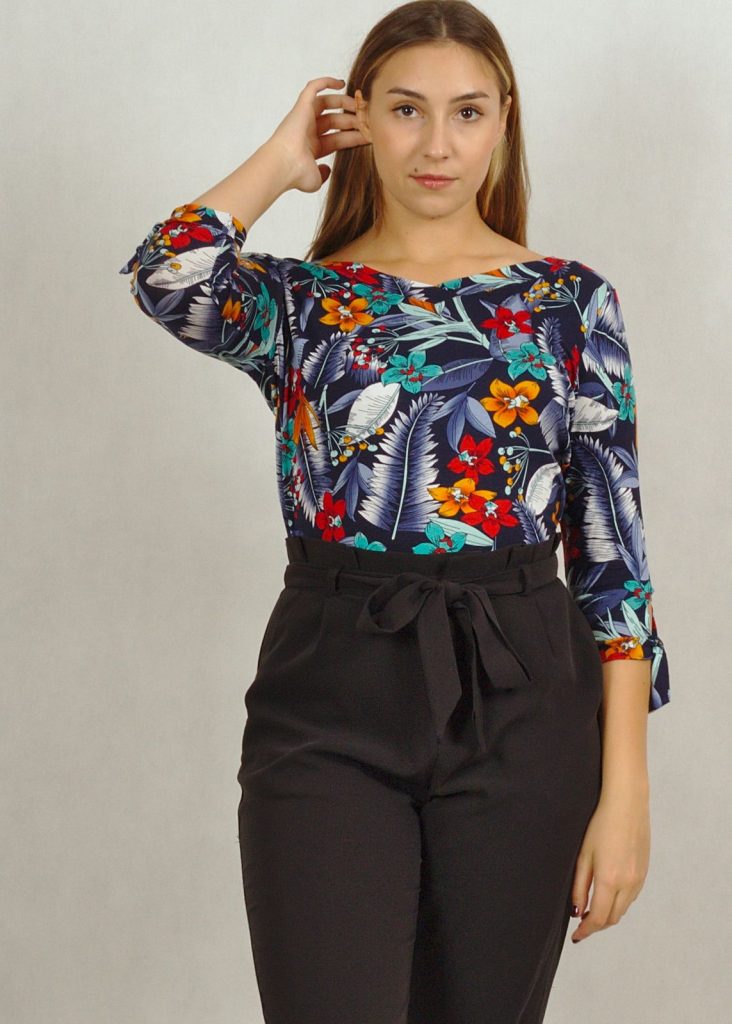 Bluzka ma bardzo ciekawy wzór kwiatowy w dwóch odcieniach: niebieskim i pomarańczowym.