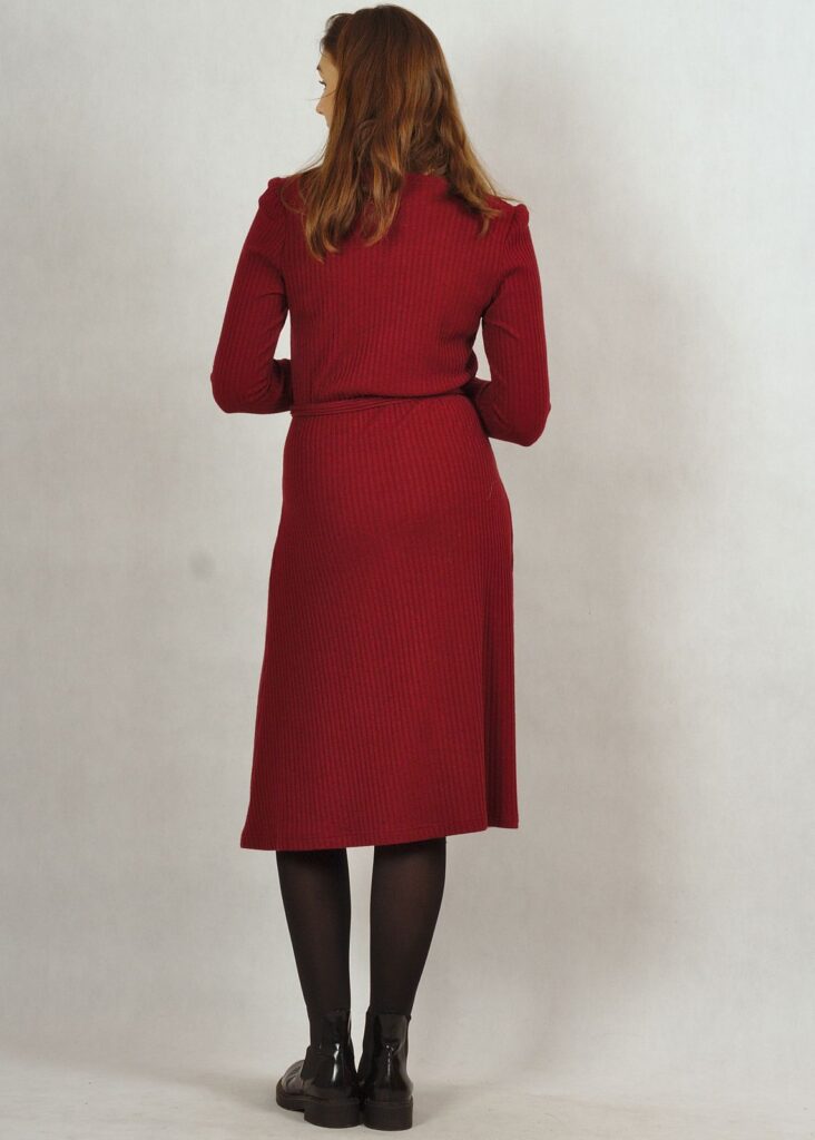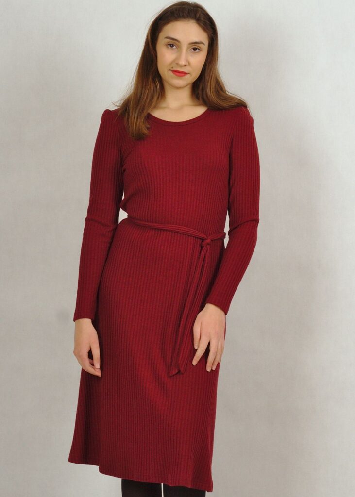 Supermodna sukienka z dzianiny prążkowanej, zawierającej w składzie wiskozę.