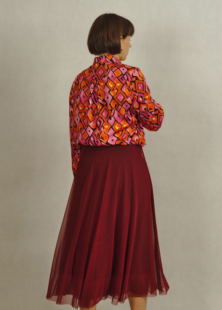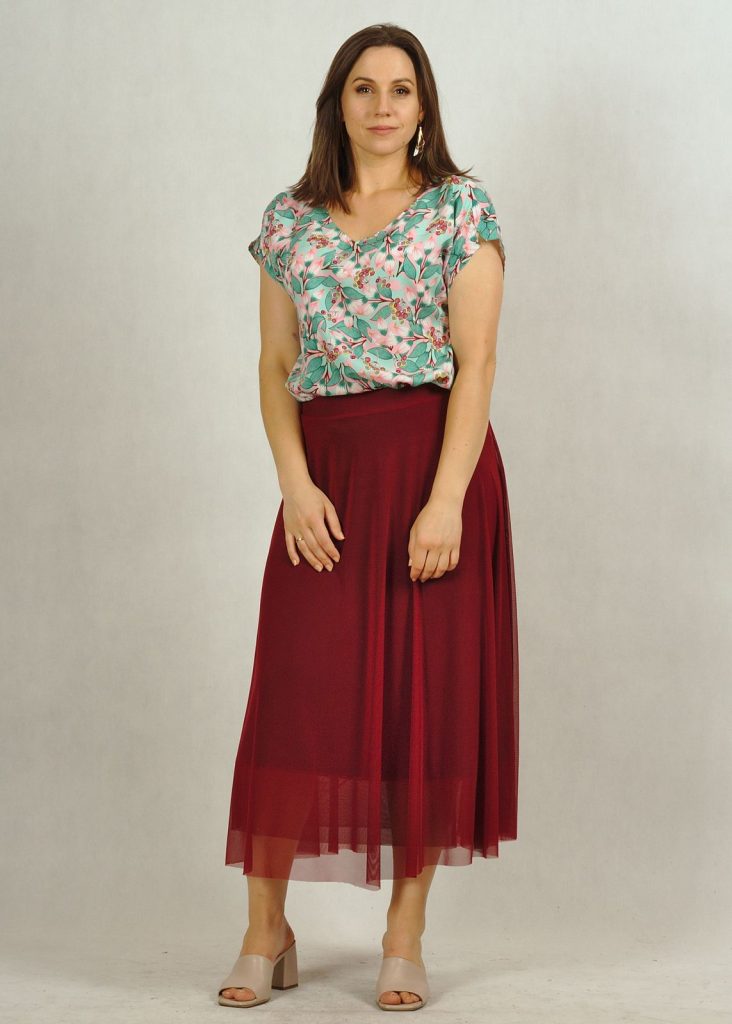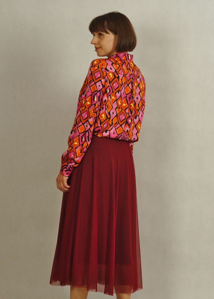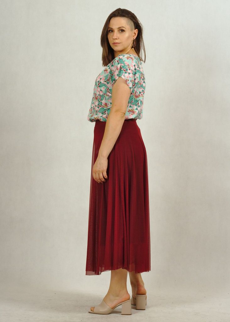 Długa spódnica składająca się z dwóch części – z wiskozowej podszewki z dzianiny oraz z poliestrowej siatki drukowanej.