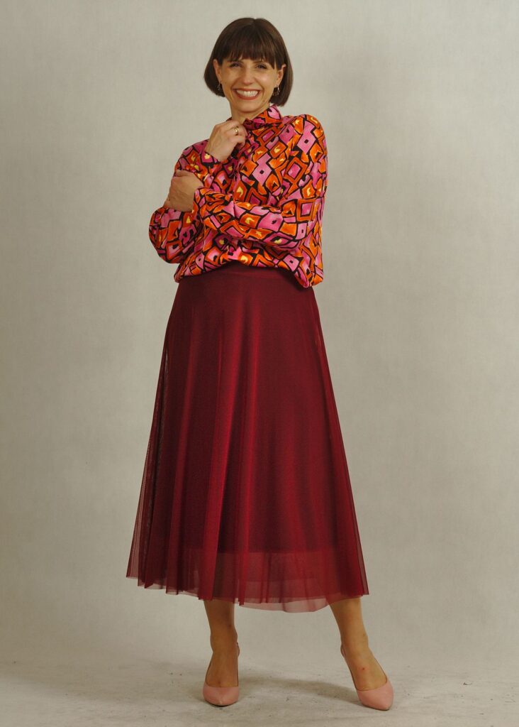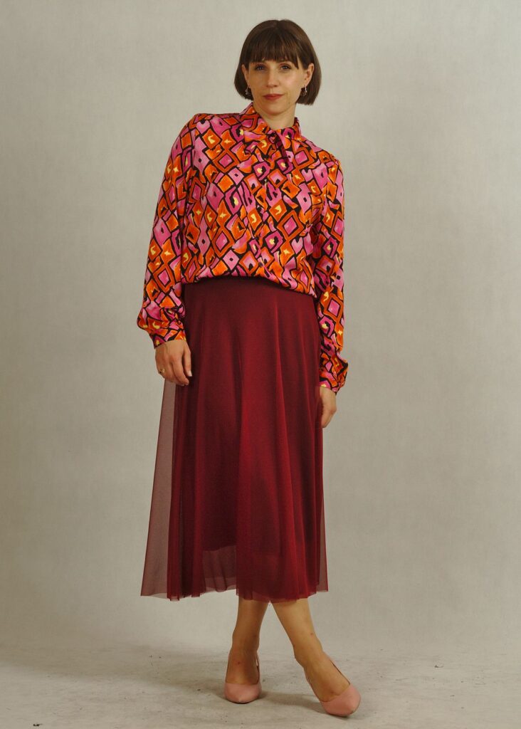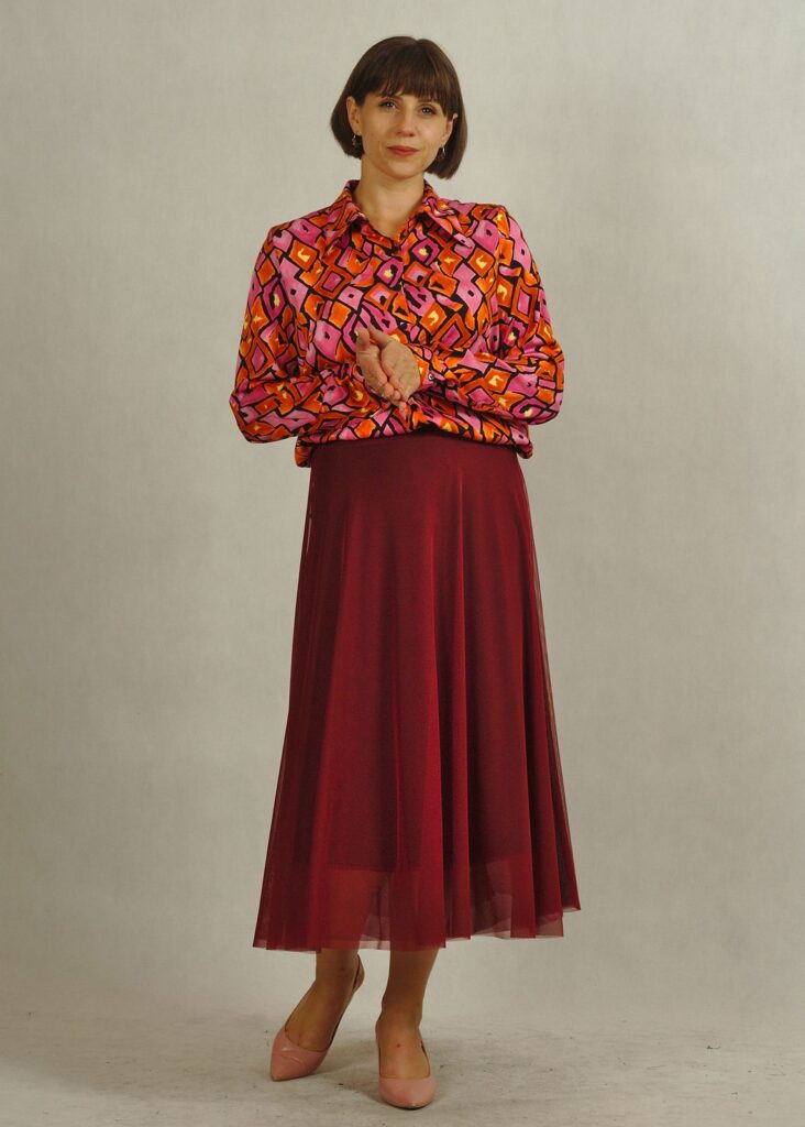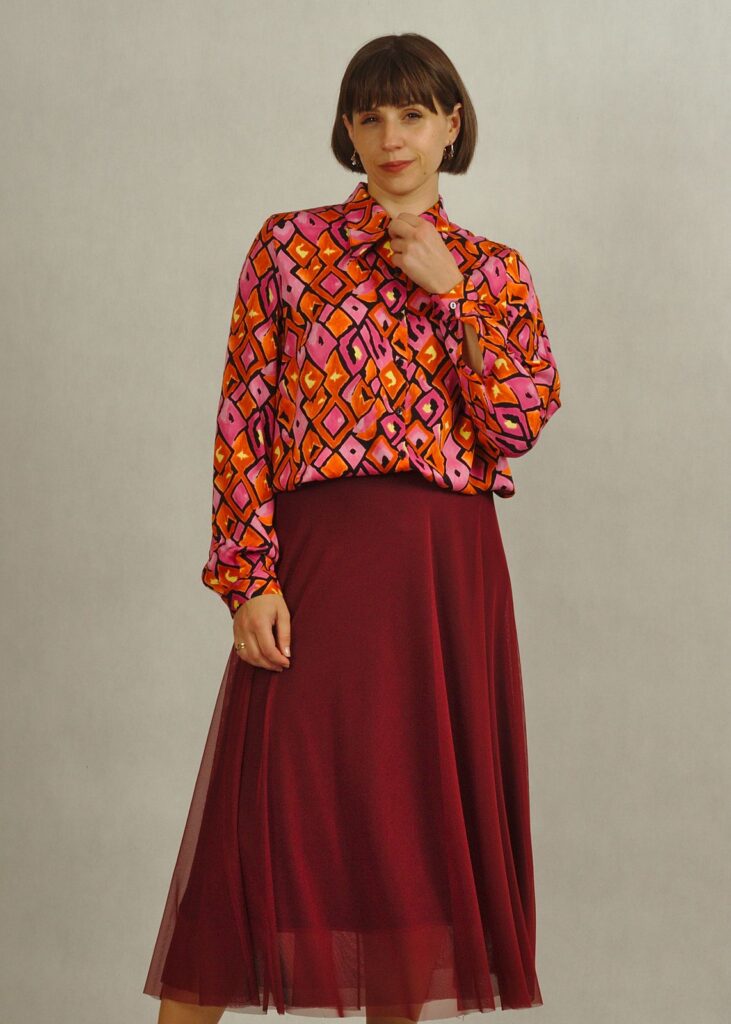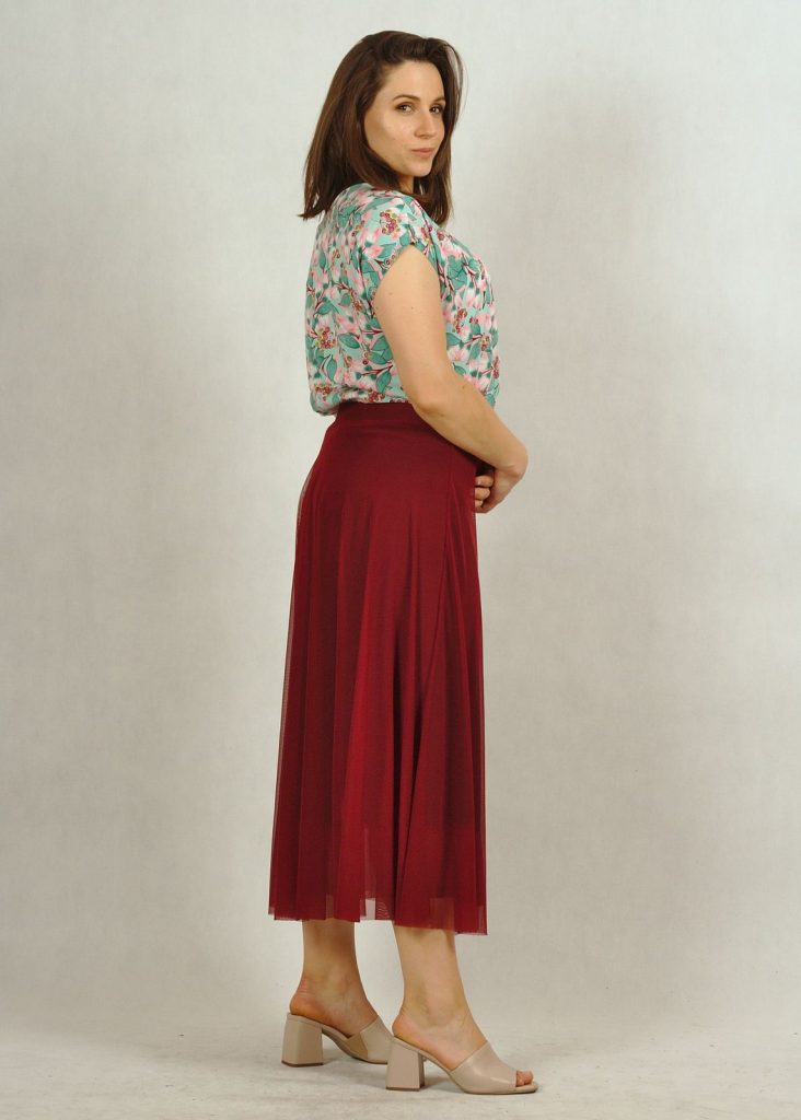 Długa spódnica składająca się z dwóch części – z wiskozowej podszewki z dzianiny oraz z poliestrowej siatki drukowanej.