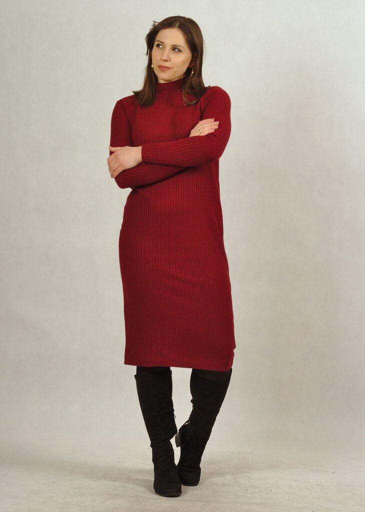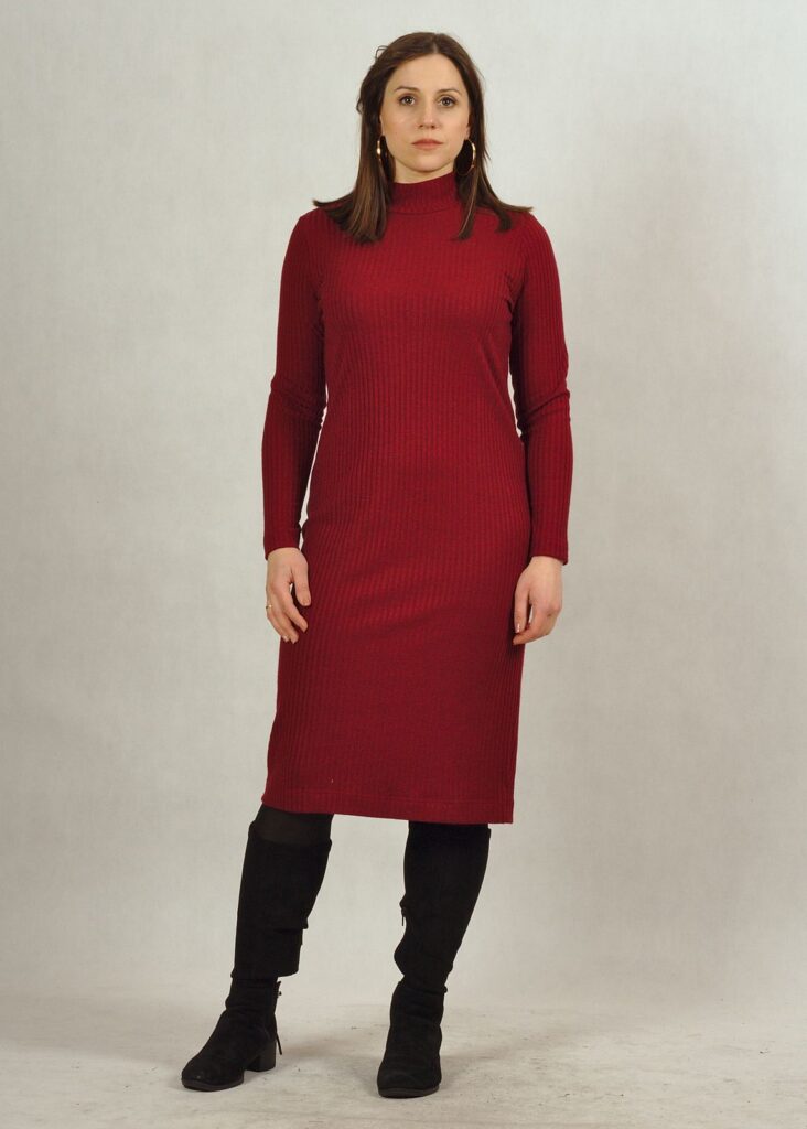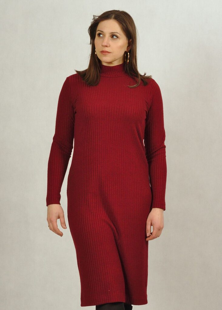Bordowa sukienka półgolf z dzianiny prążkowanej /717/