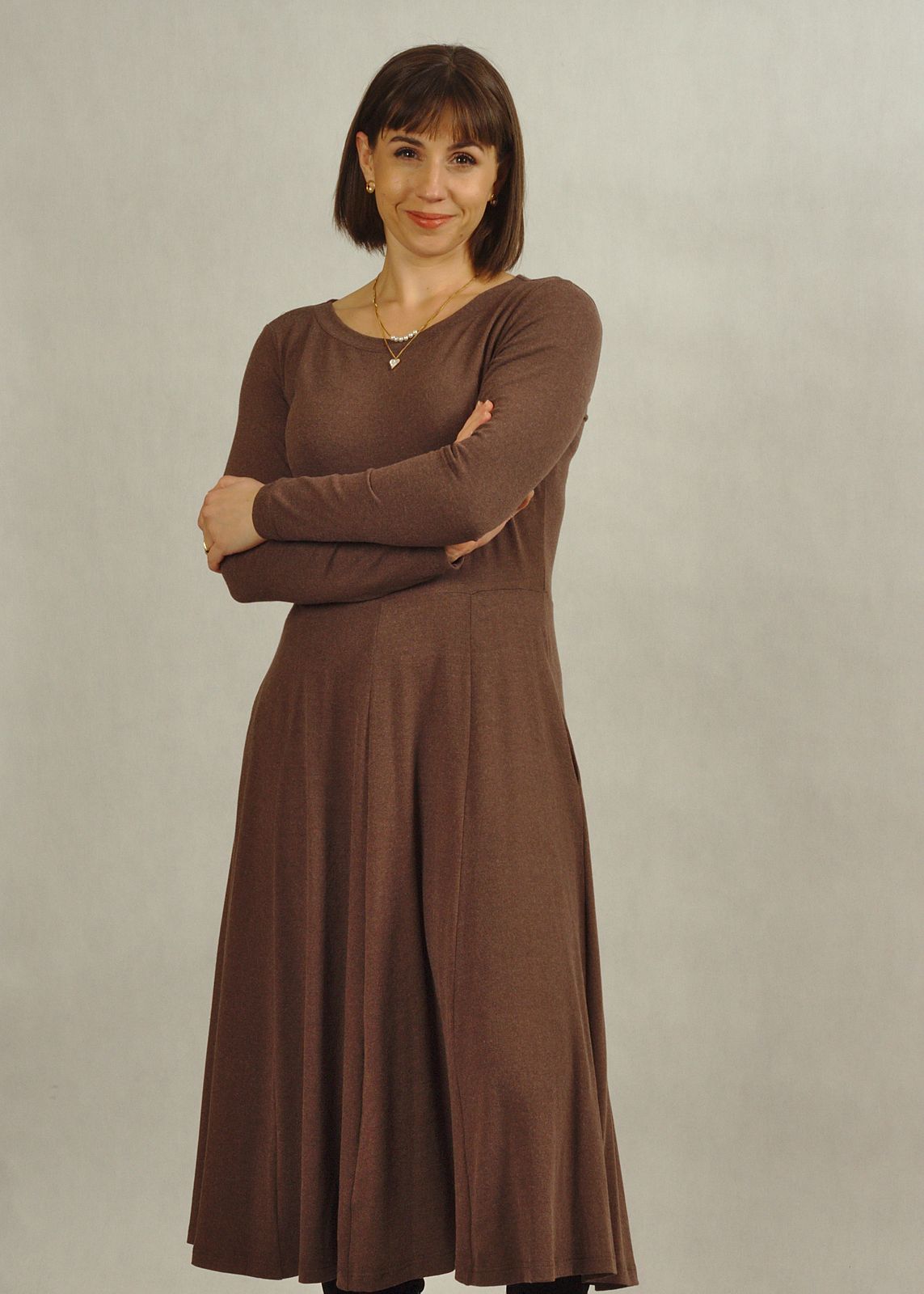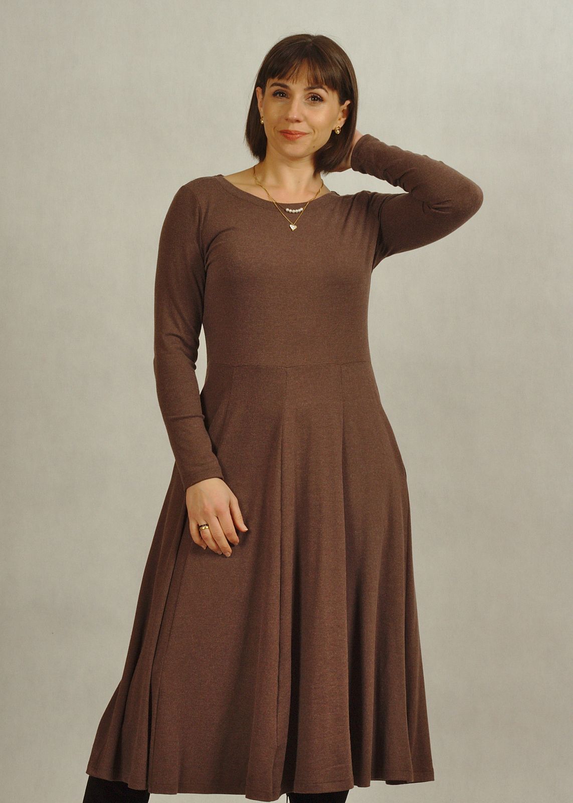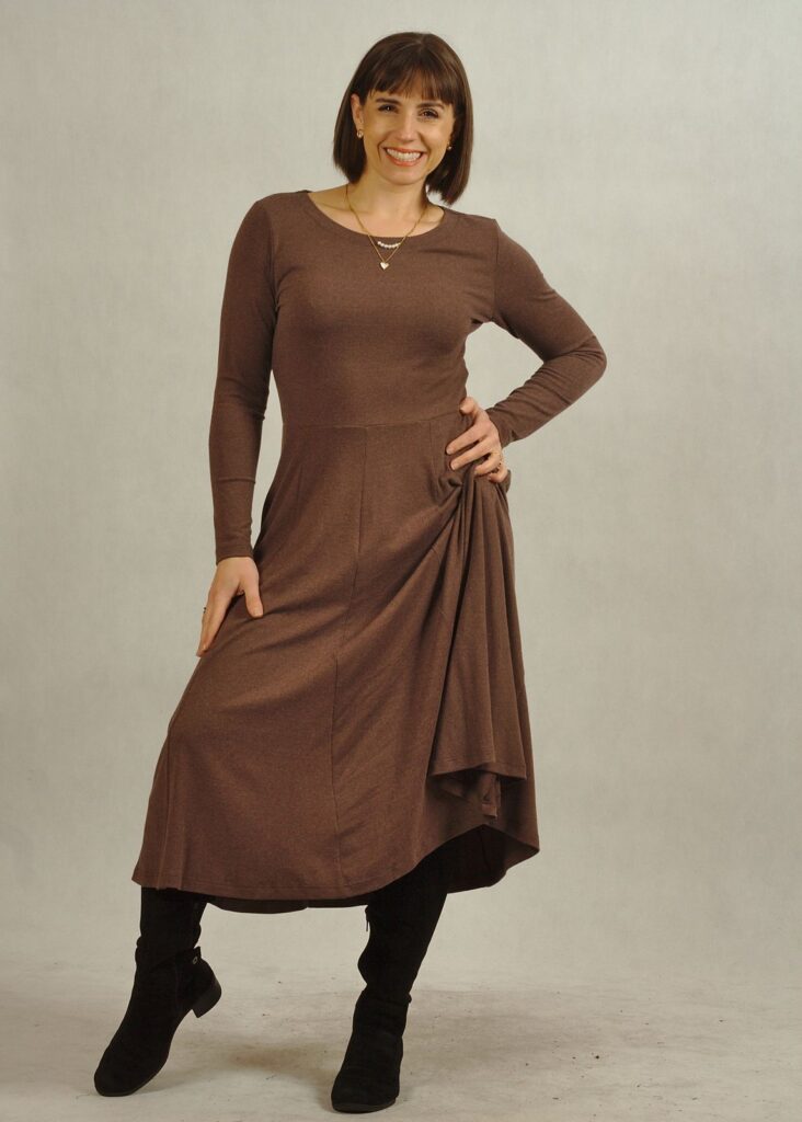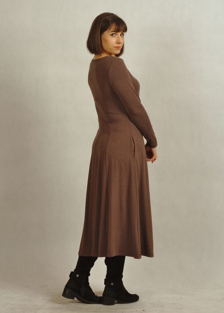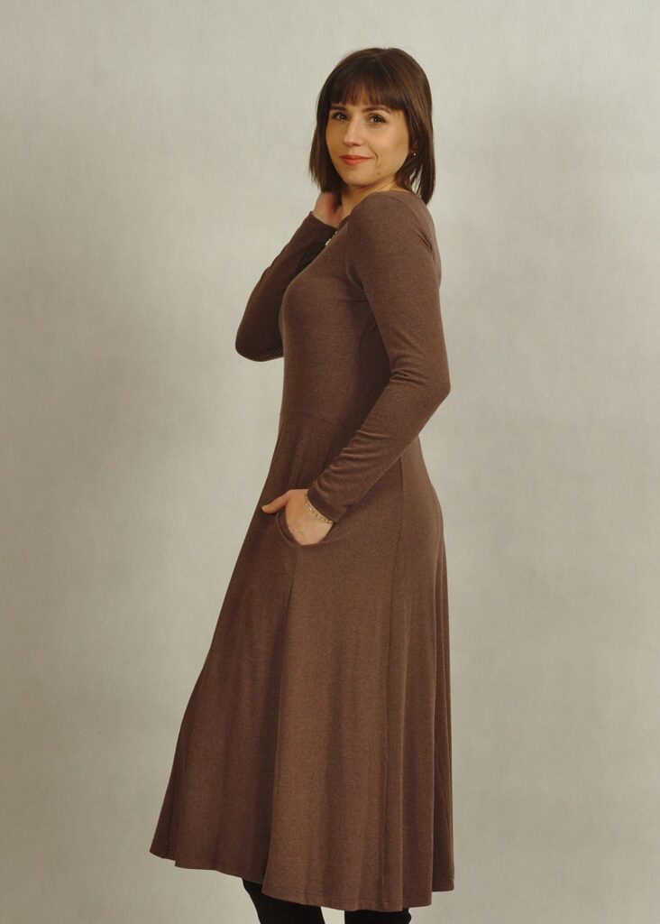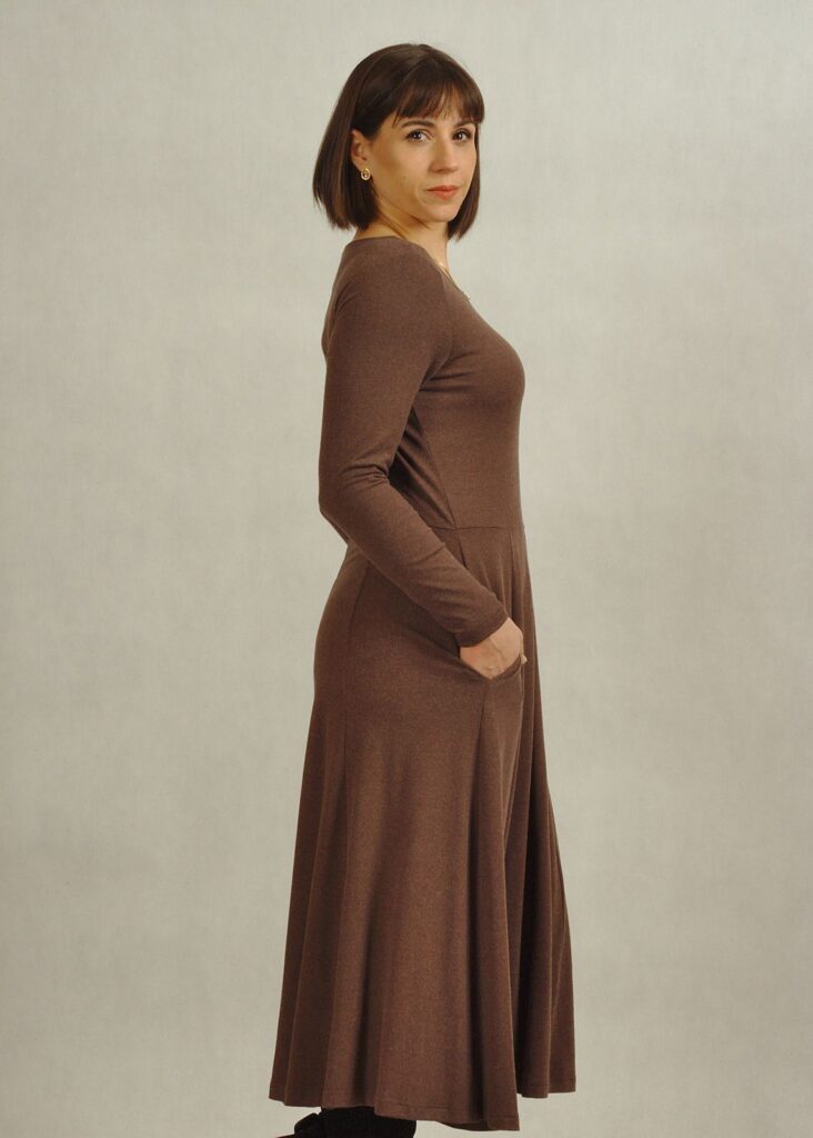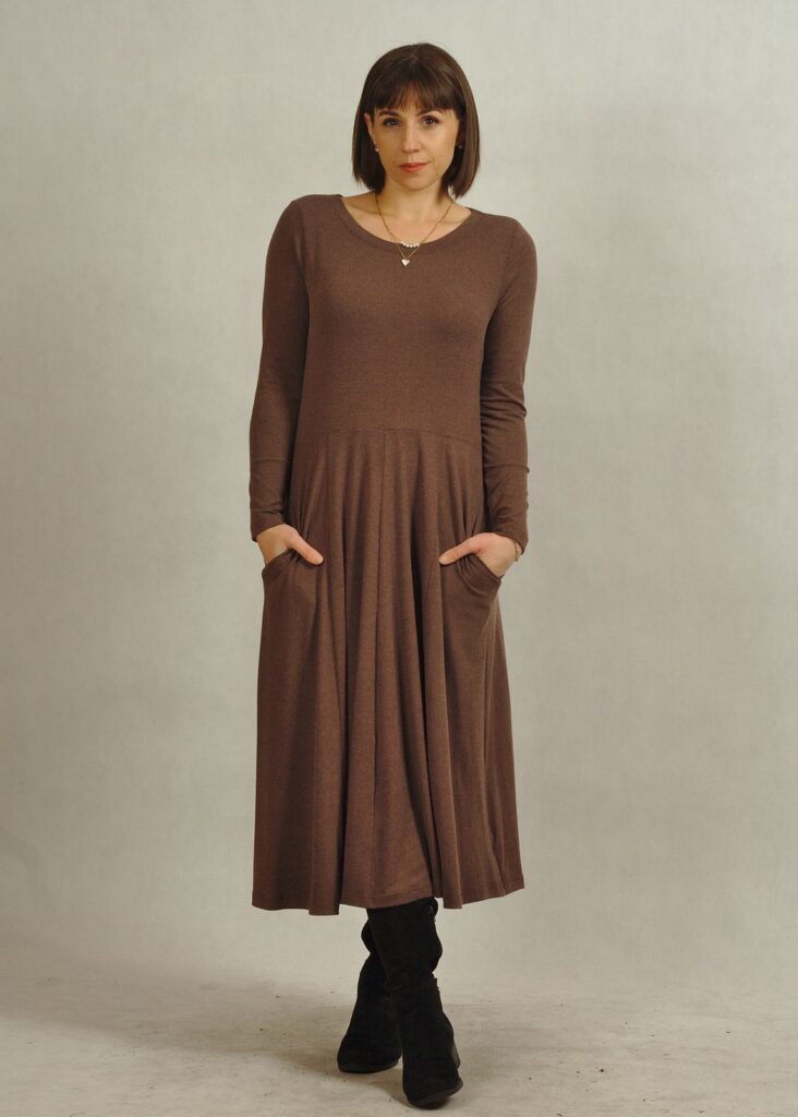 Brązowa ciepła sukienka z kieszeniami plus size /722/