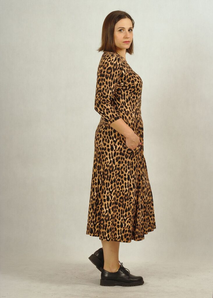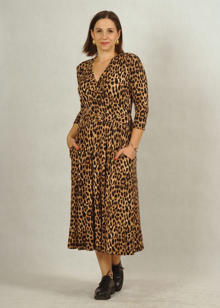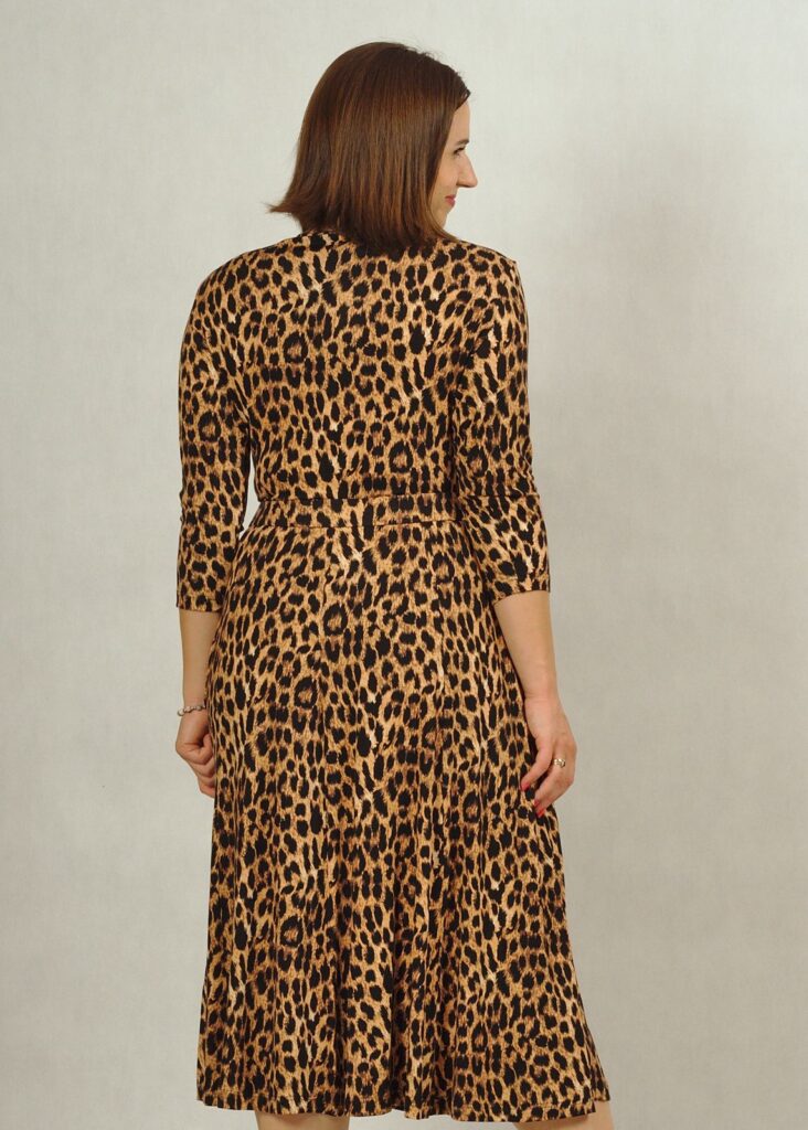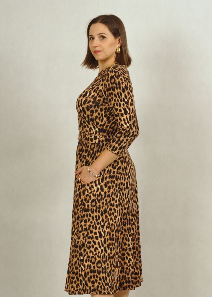 Sukienka ma kolor brązowy* z drukiem w panterkę.