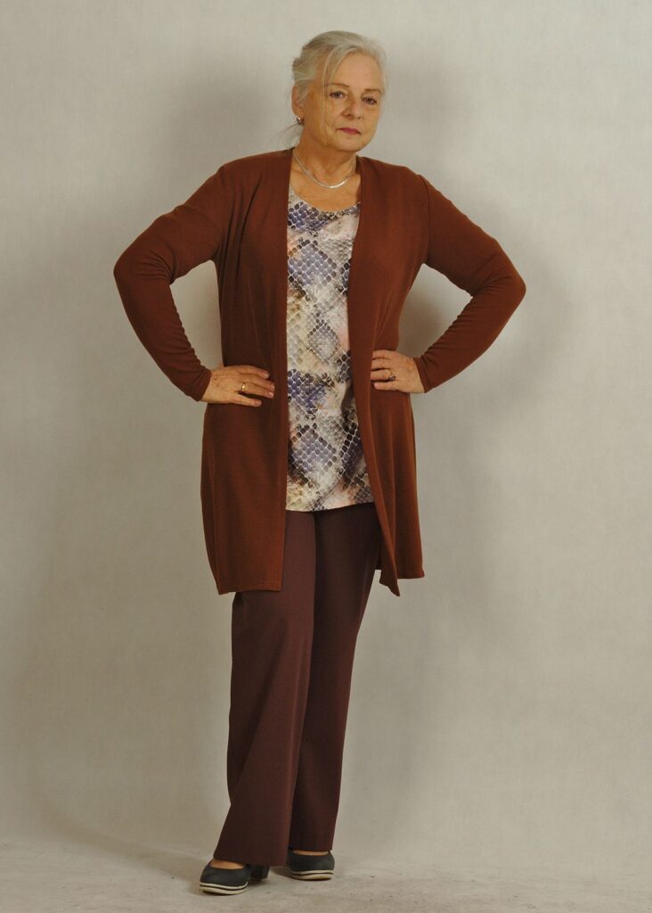Modelka ma 165 cm wzrostu i nosi rozmiar L.