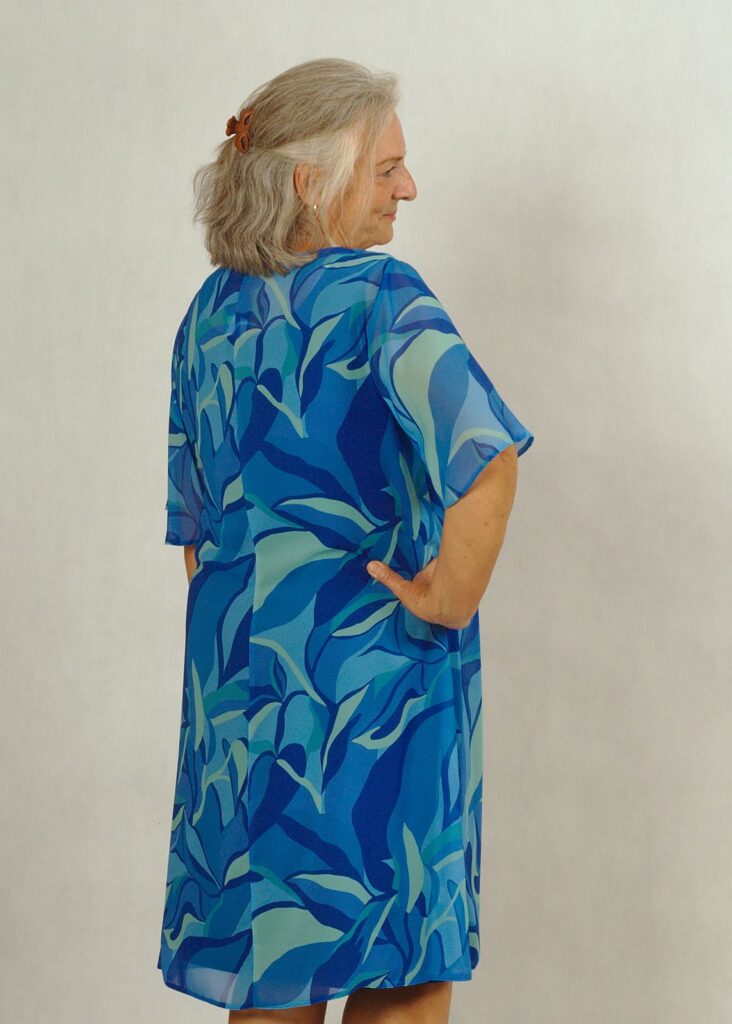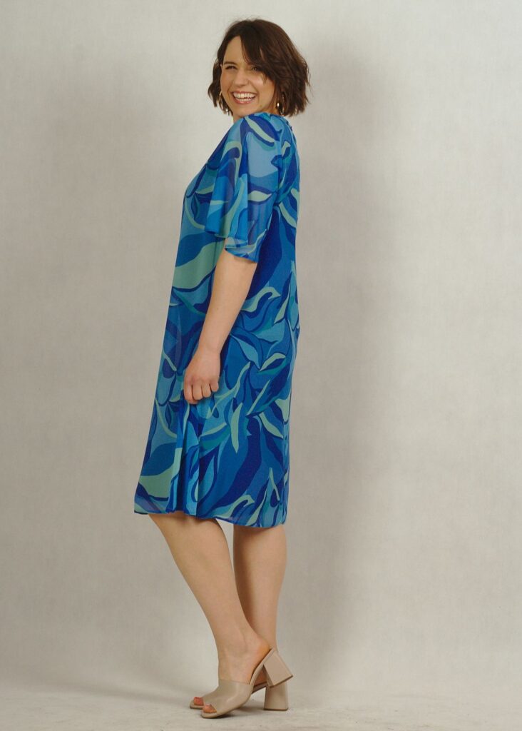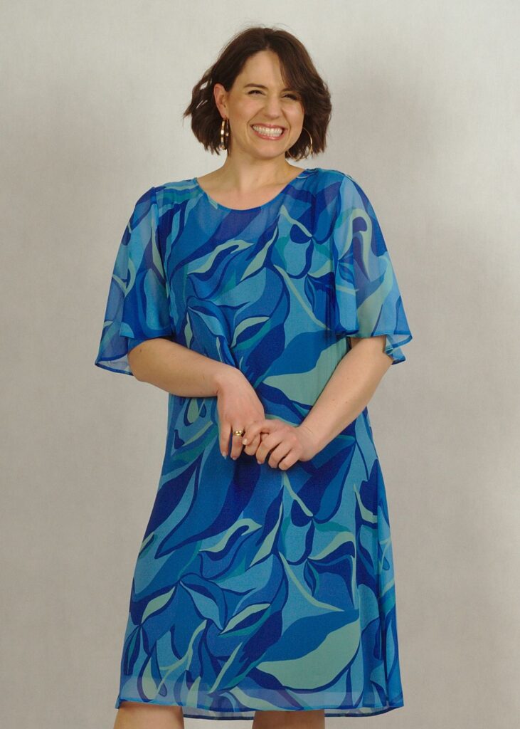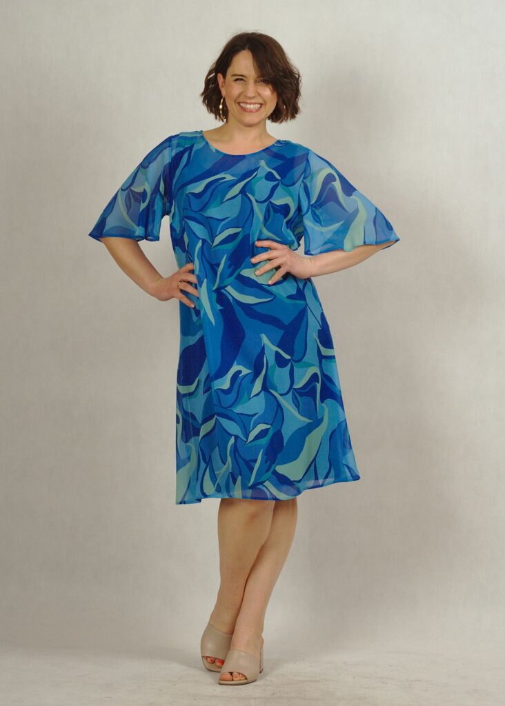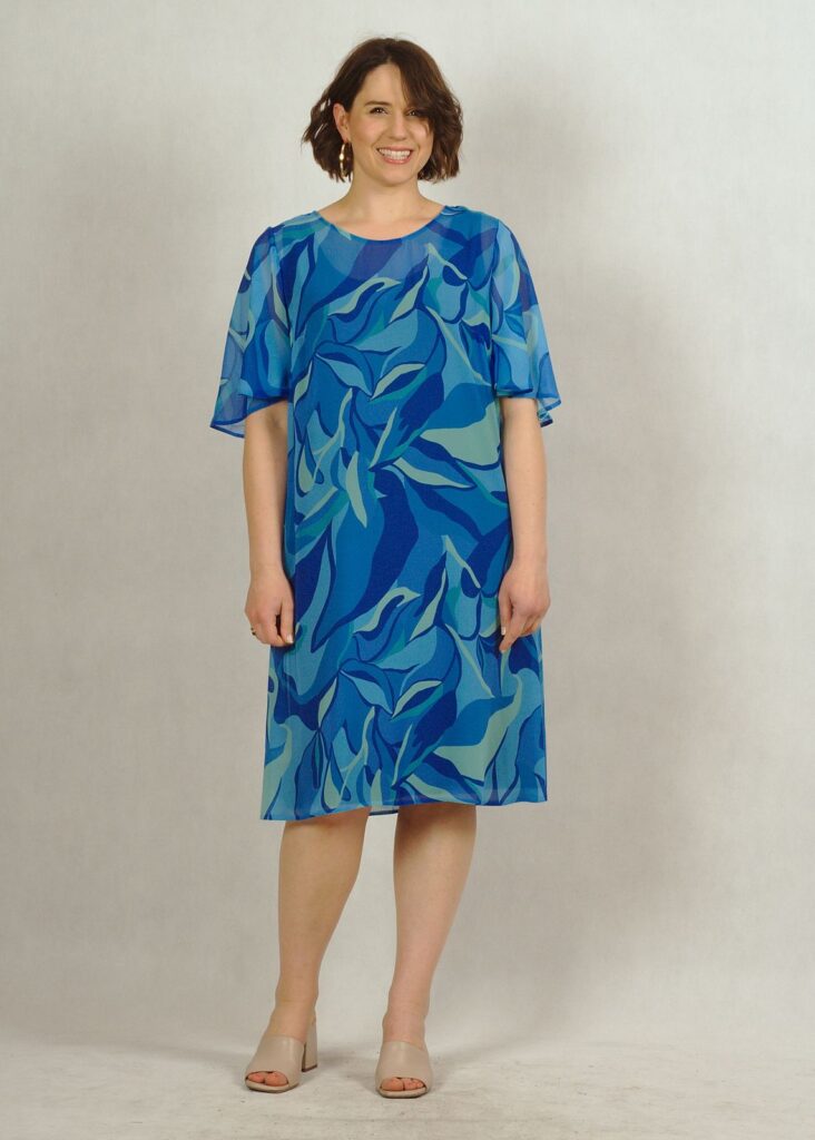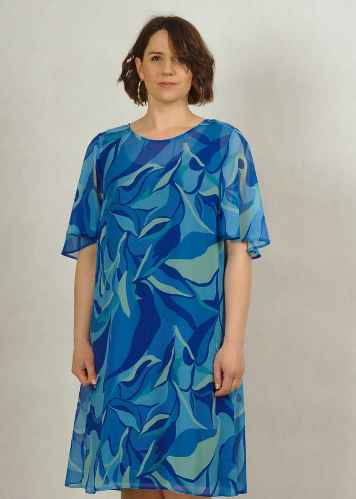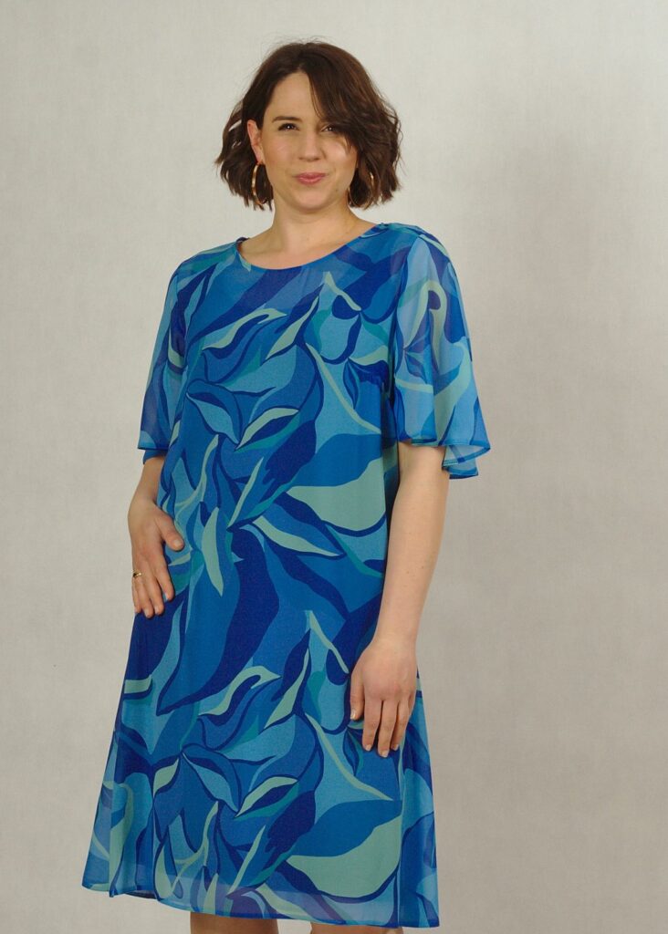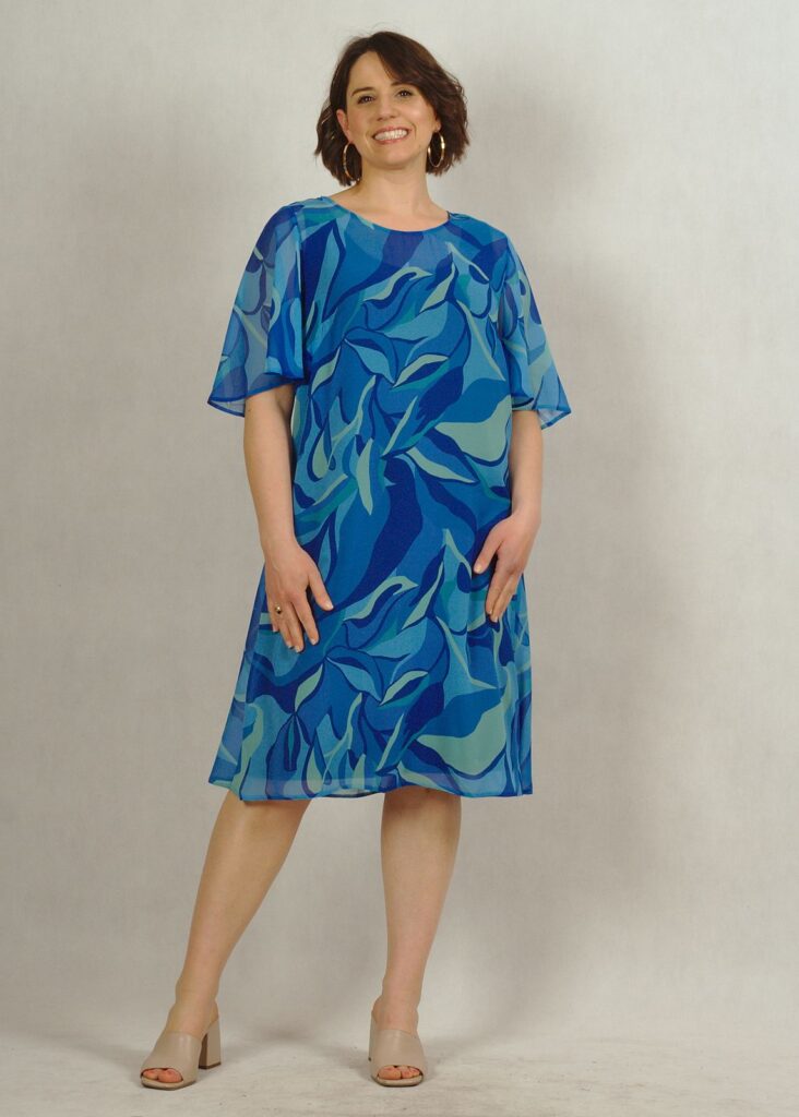 Ozdobny krótki rękawek typu “motylek” nadaje lekkości sylwetce, a też idealnie kryje ramiona.