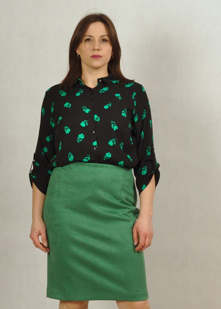 Bluzka ma kolor czarny, z drobnymi, zielonymi listkami – przykuwającymi spojrzenie.