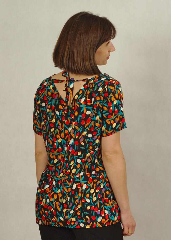 Bluzka zakończona jest falbanką z tyłu na dole, co daję uroku i kryje mankamenty sylwetki.