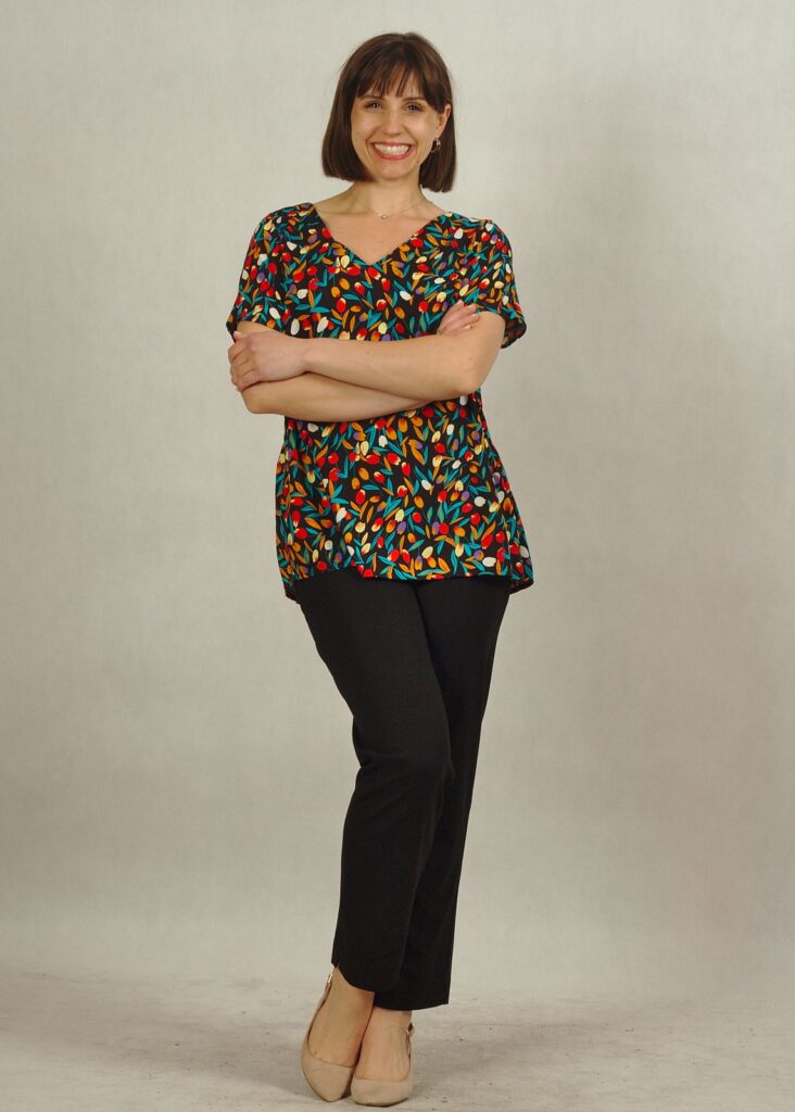 Bluzka ma prosty, krótki rękaw, dzięki temu pasuje i do klasycznych dżinsów i do spódnicy.