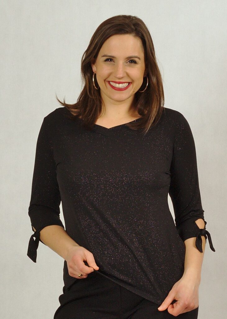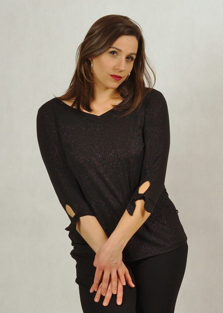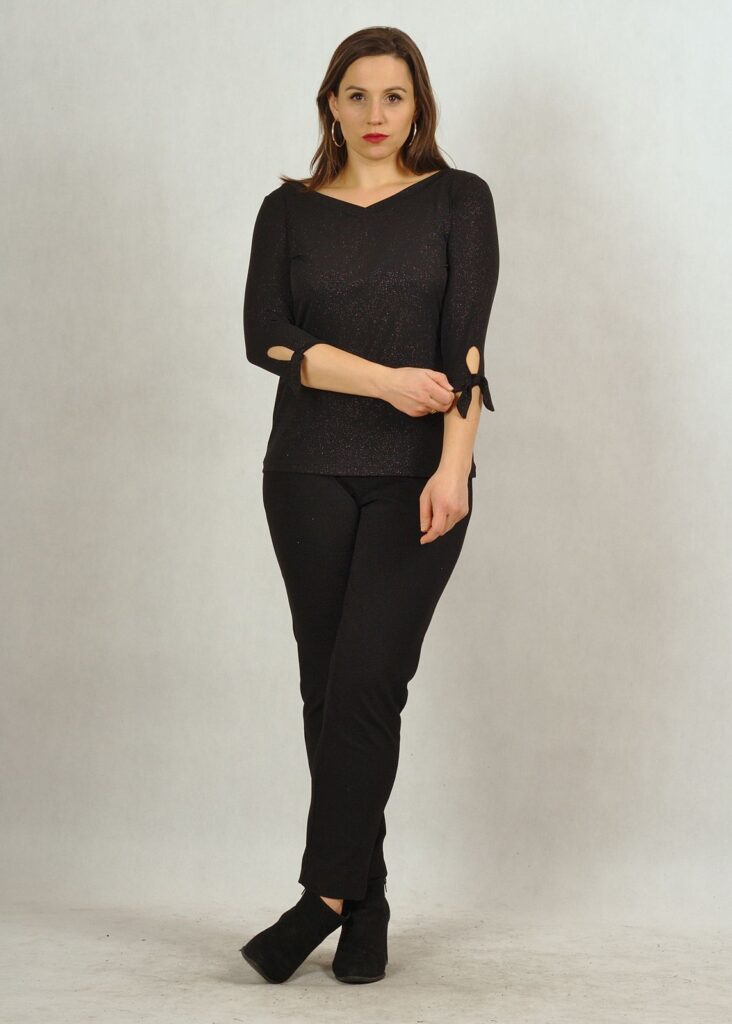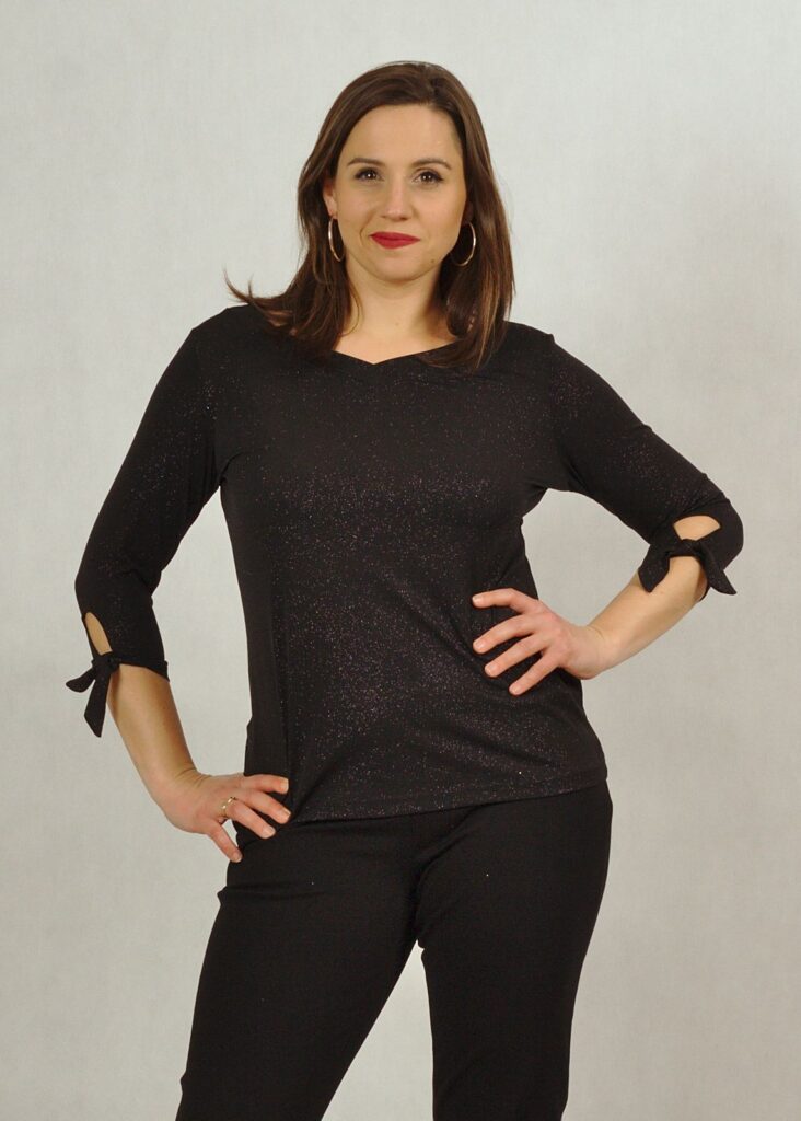 Bluzka bazowa w kolorze czarnym* z ozdobnym rękawem to ponadczasowy model. Jest tak uniwersalny, że możesz go łączyć zarówno ze spodniami, jak i ze spódnicą – sprawdzi się świetnie na co dzień.