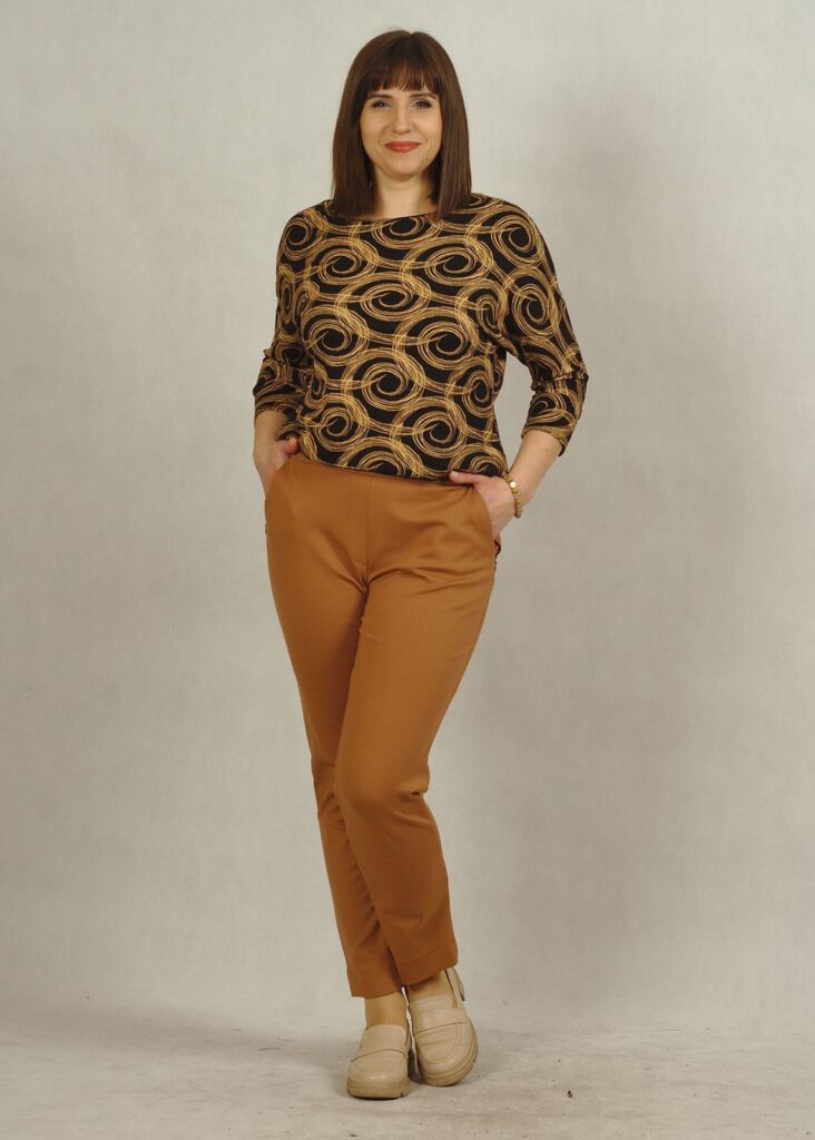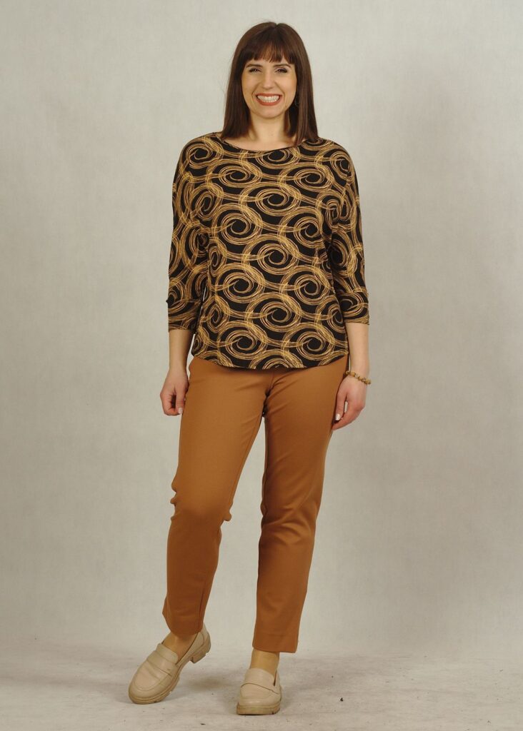 Bluzka w kropki posiada półokrągły dekolt. Rękaw 3/4 kimono z mankietem, tzw.’ nietoperz’ daje swobodę w użytkowaniu.