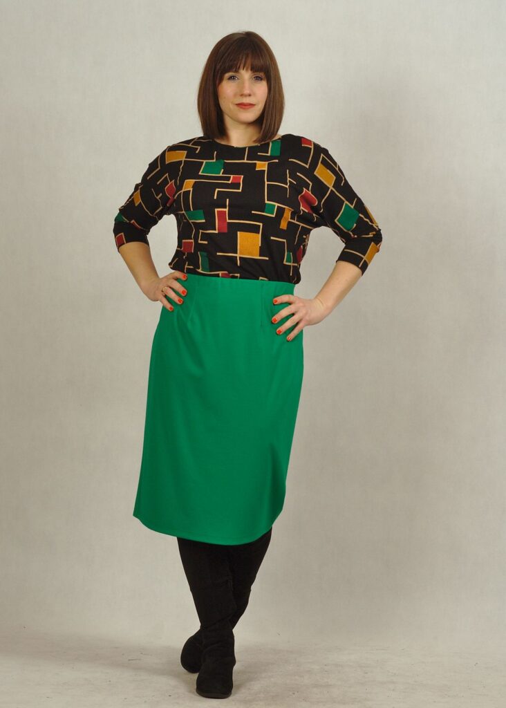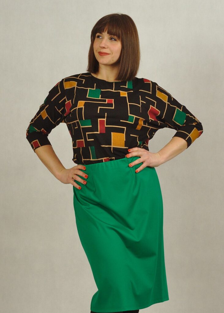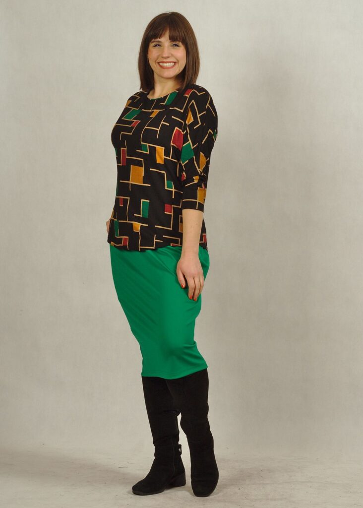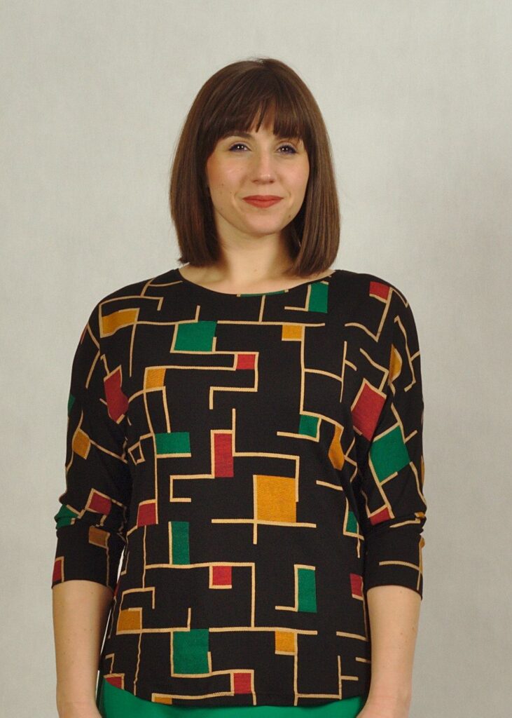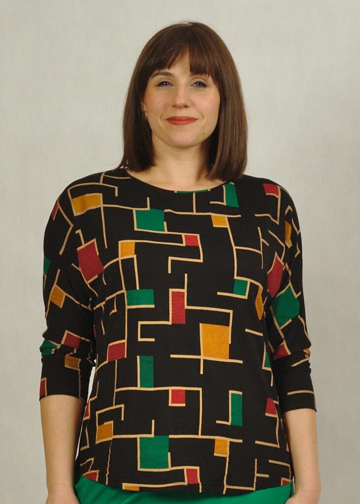 Bluzka we wzory posiada półokrągły dekolt. Rękaw 3/4 kimono z mankietem, tzw.’ nietoperz’ daje swobodę w użytkowaniu.