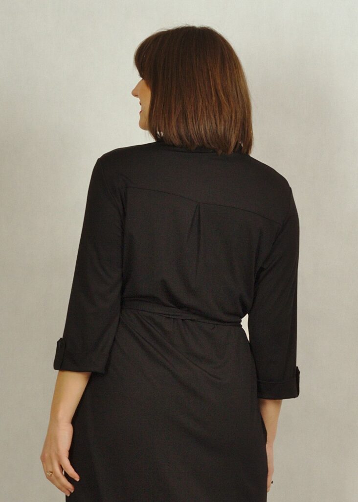 Sukienka z guzikami wygląda bardzo klasycznie. Dekolt pięknie odkryty kołnierzykiem.