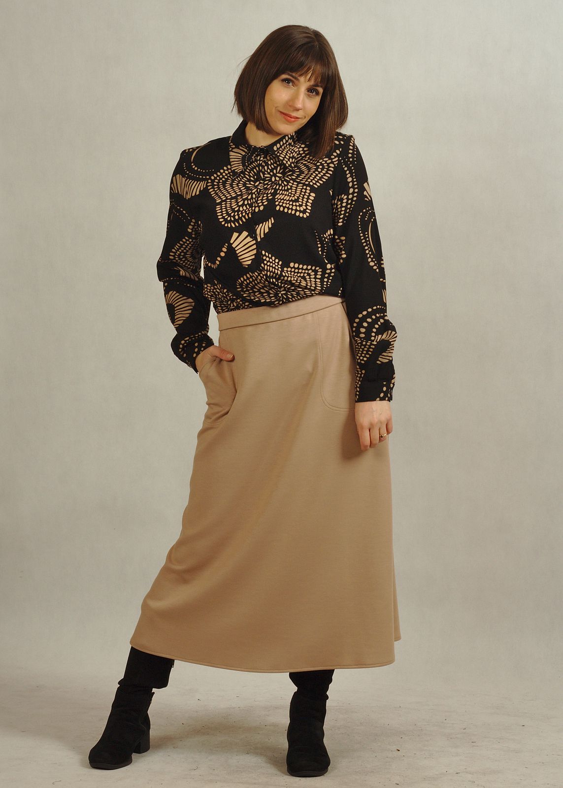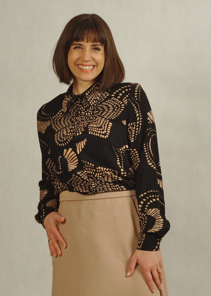 Koszula w beżowe wzory – dodaje jej bardzo eleganckiego charakteru.